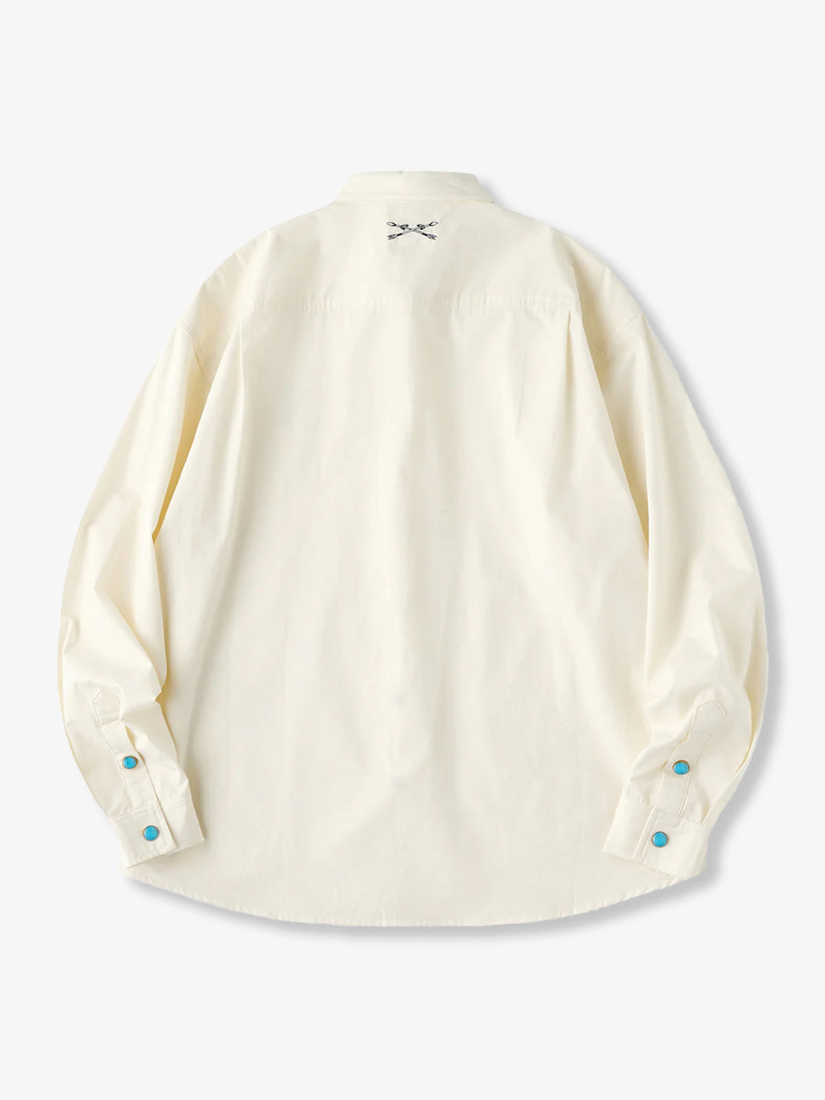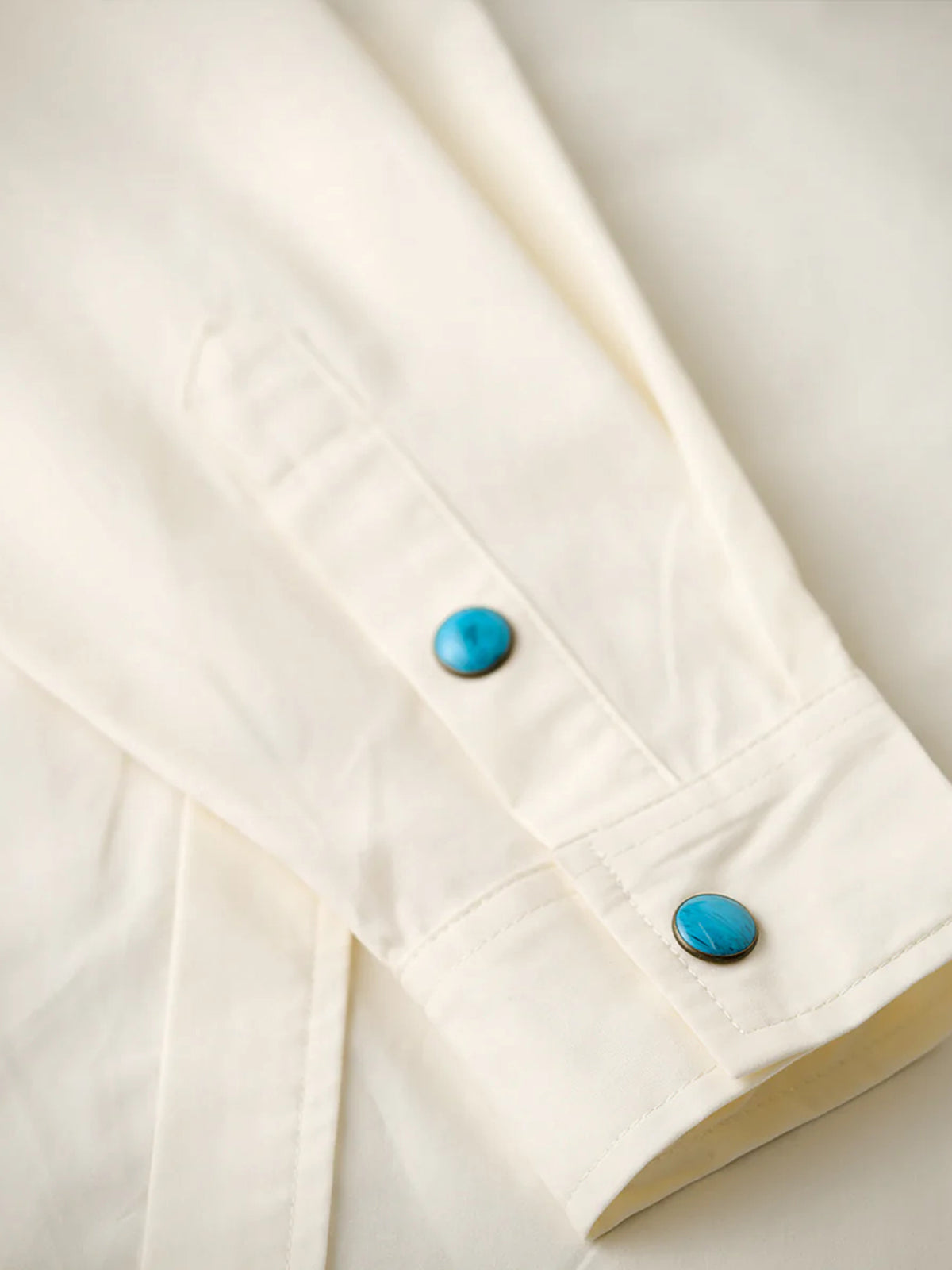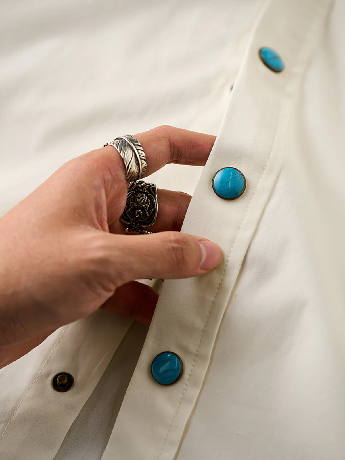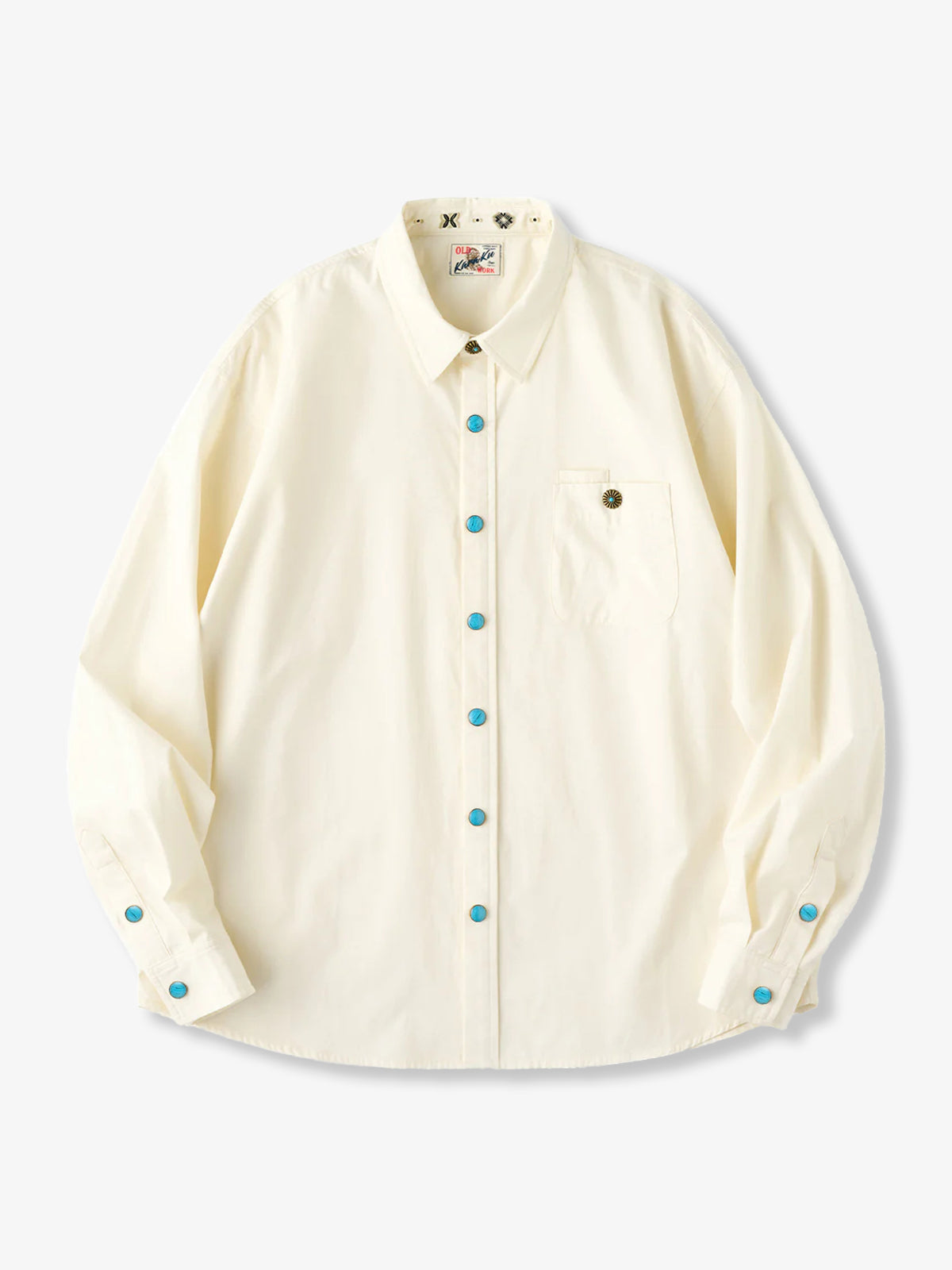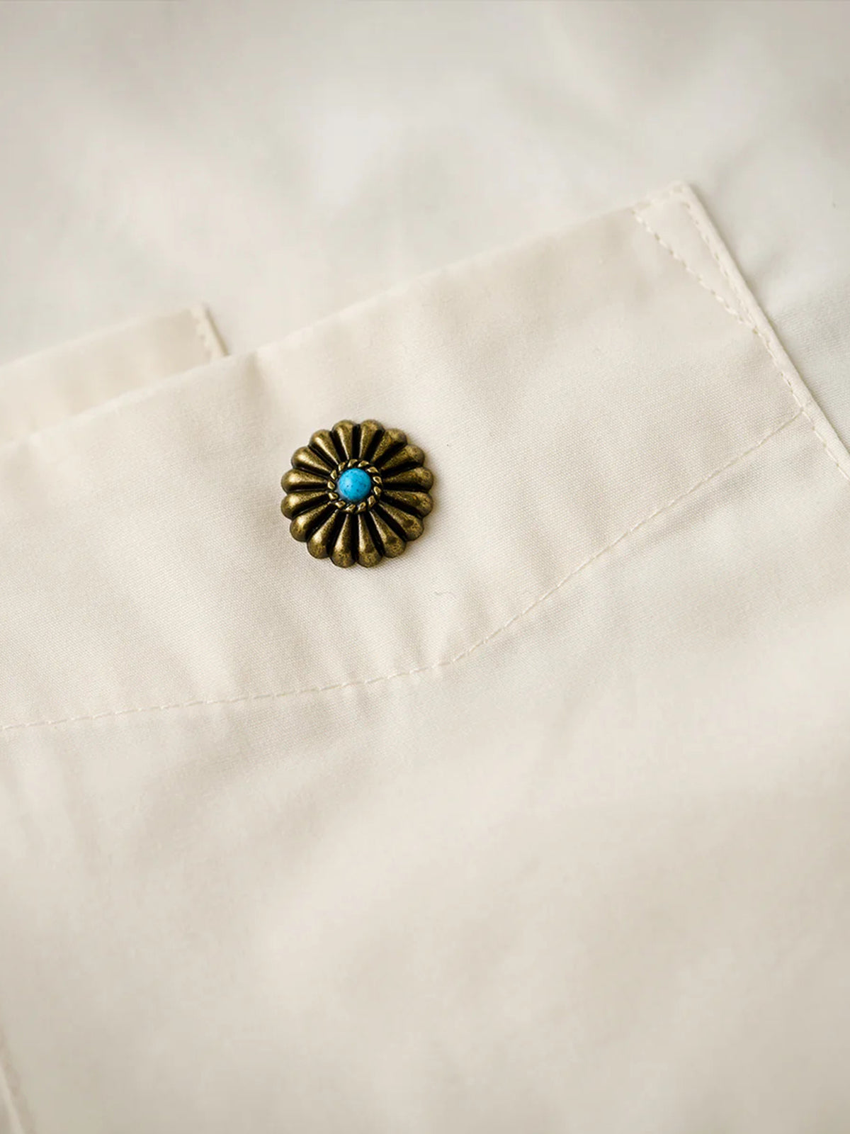 The buttons on the left breast pocket are also made of turquoise metal buttons, surrounded by antique gold and silver frames. The same button design is used on the center line of the front, cuffs and collar to create a sense of unity. The back yoke is embroidered with a design of two crossed arrows, and black and dark gray threads are used to emphasize the soft tones of the entire shirt.
