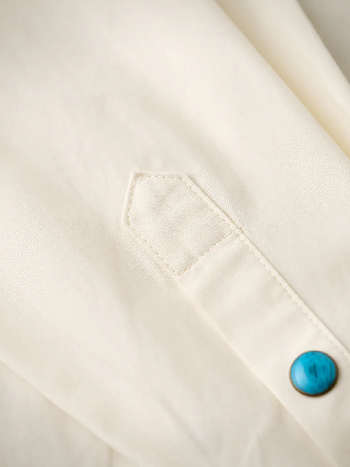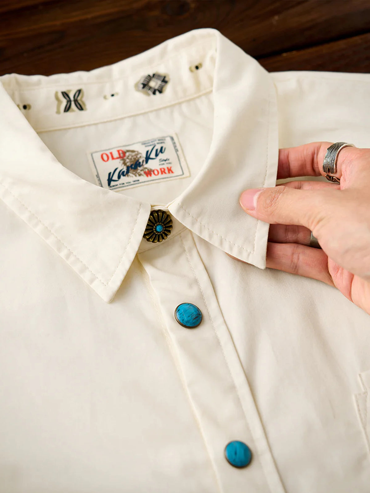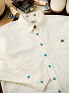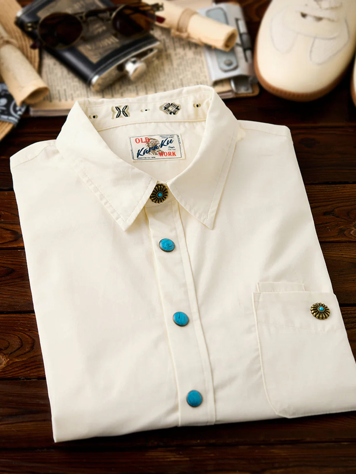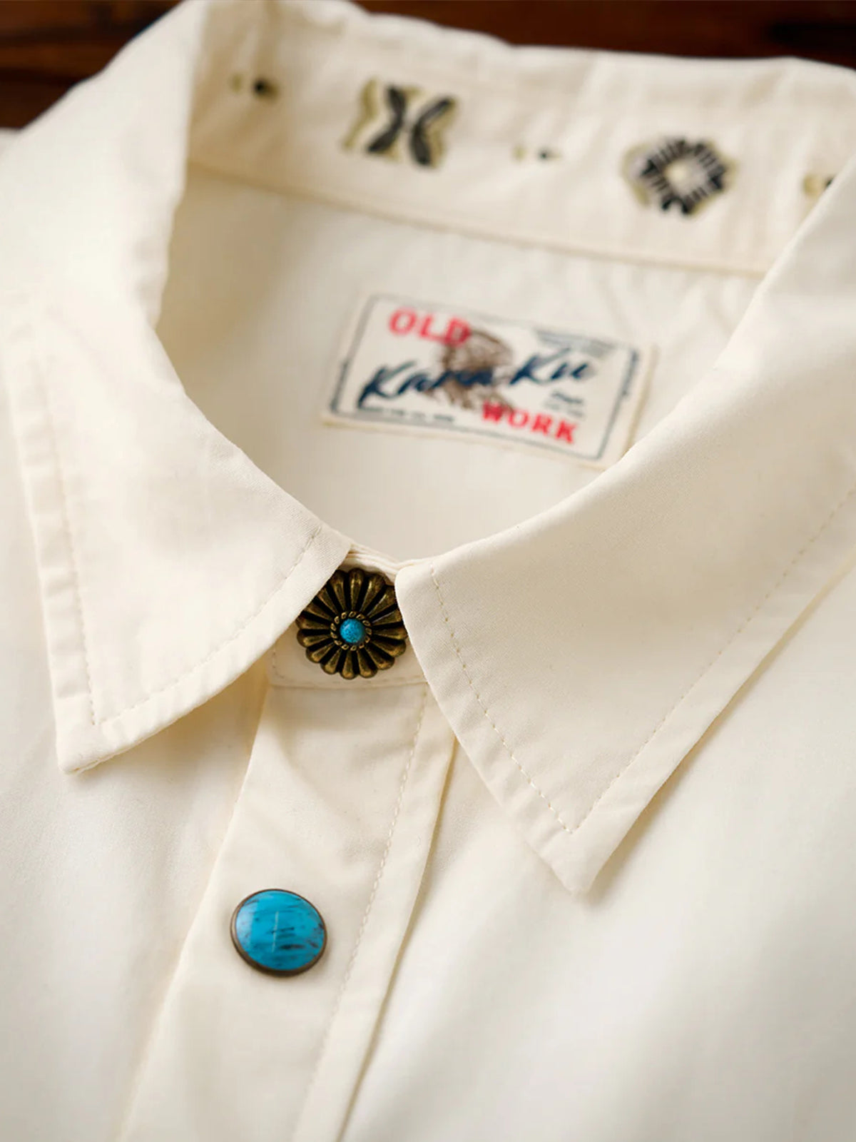 The buttons on the left breast pocket are also made of turquoise metal buttons, surrounded by antique gold and silver frames. The same button design is used on the center line of the front, cuffs and collar to create a sense of unity. The back yoke is embroidered with a design of two crossed arrows, and black and dark gray threads are used to emphasize the soft tones of the entire shirt.