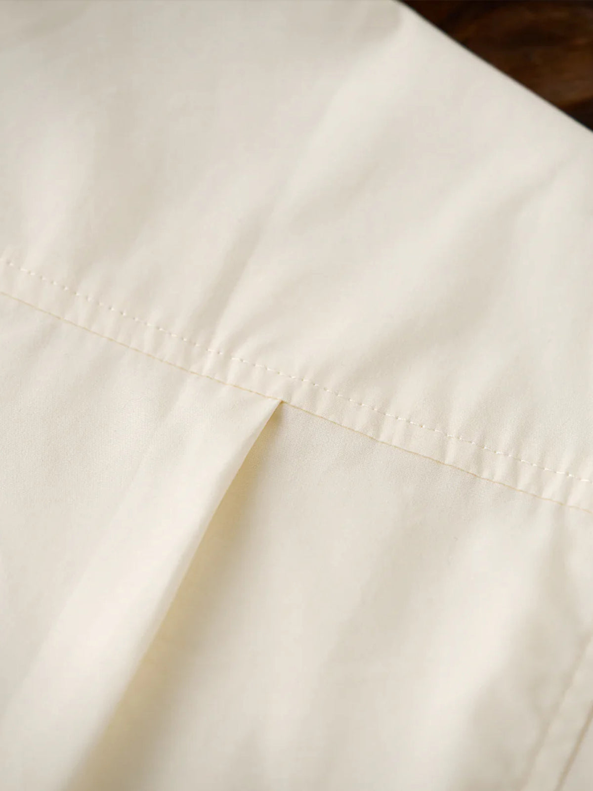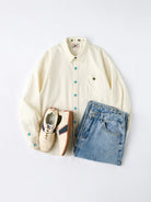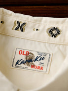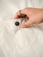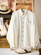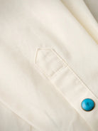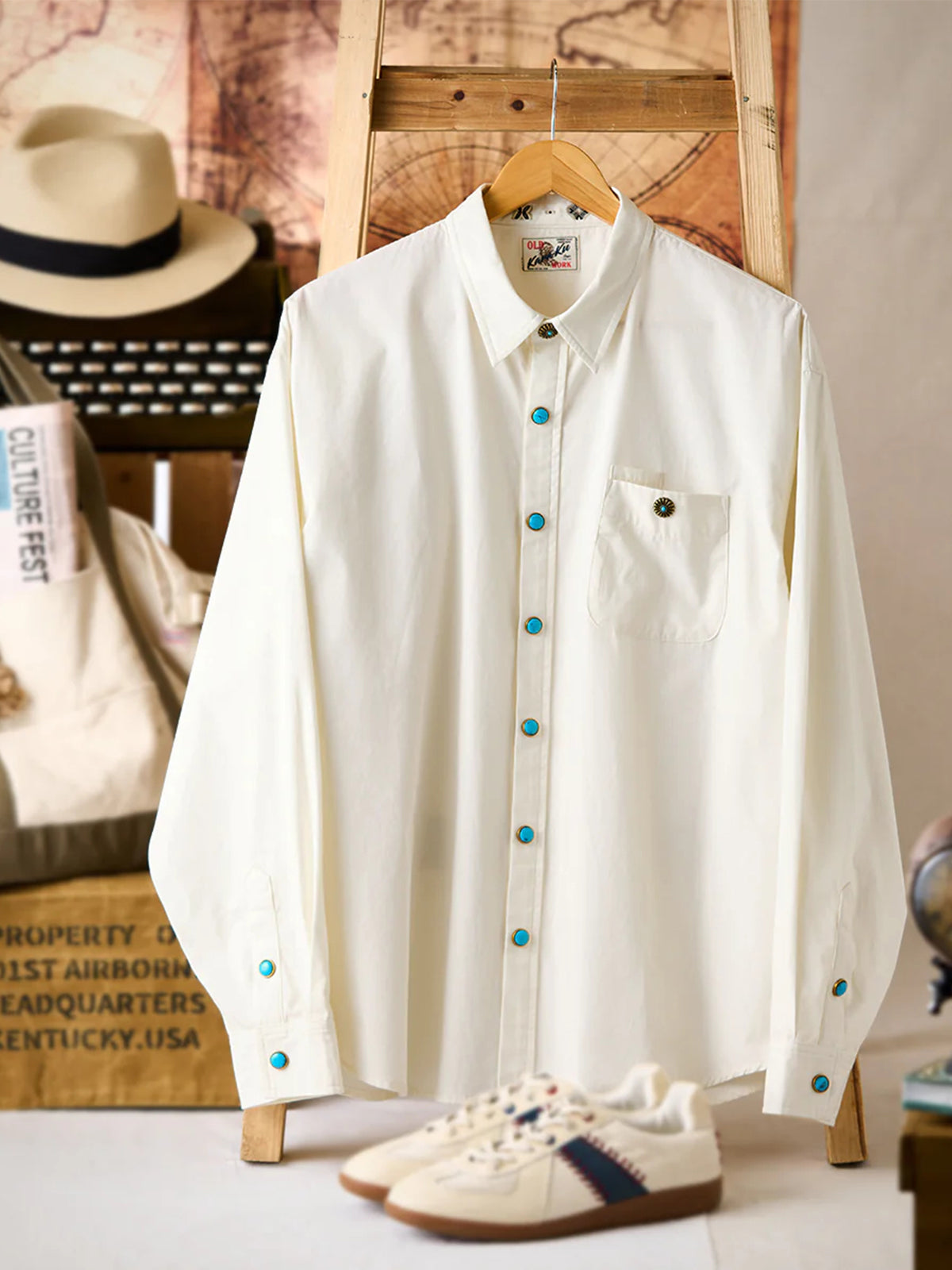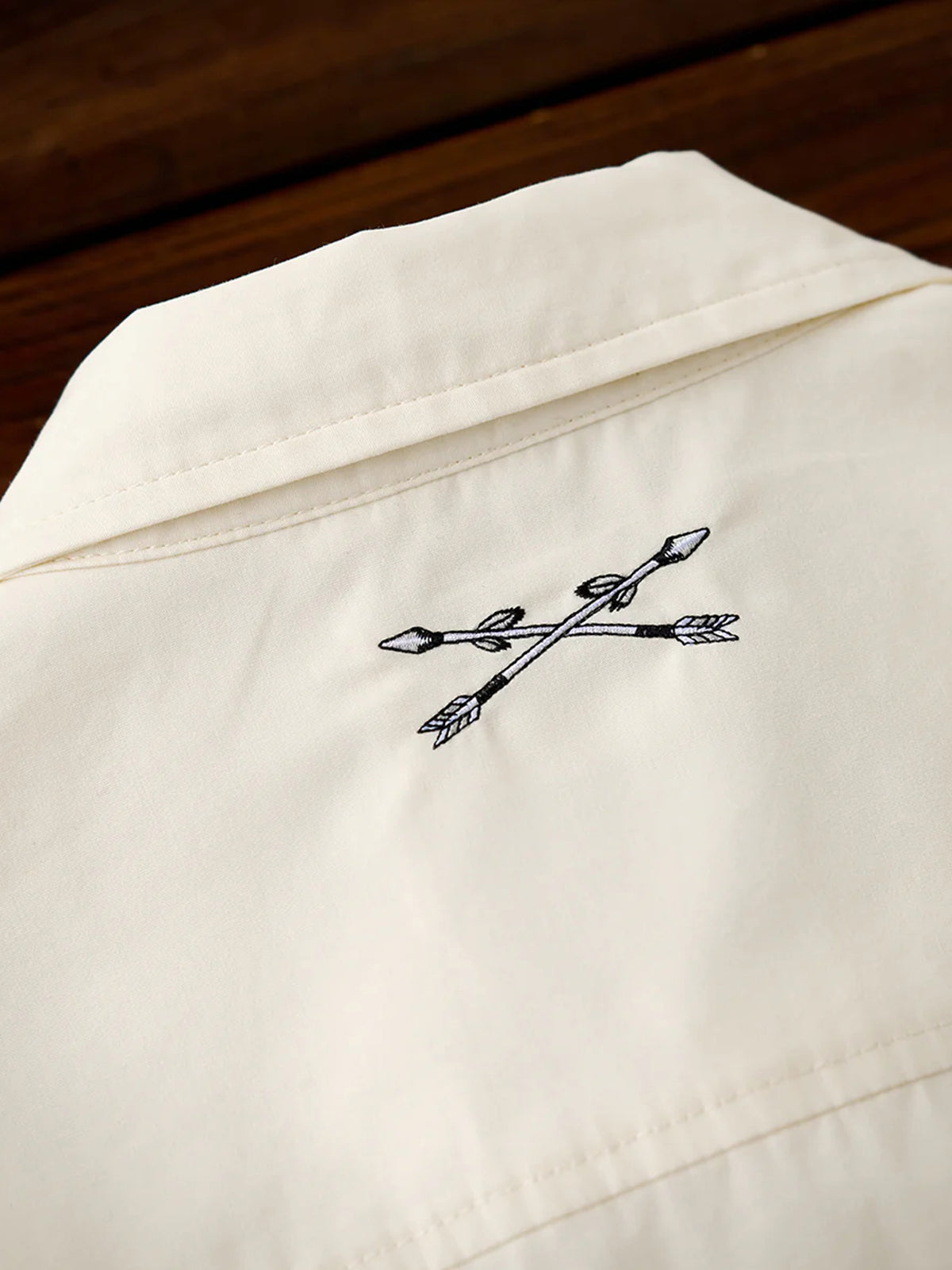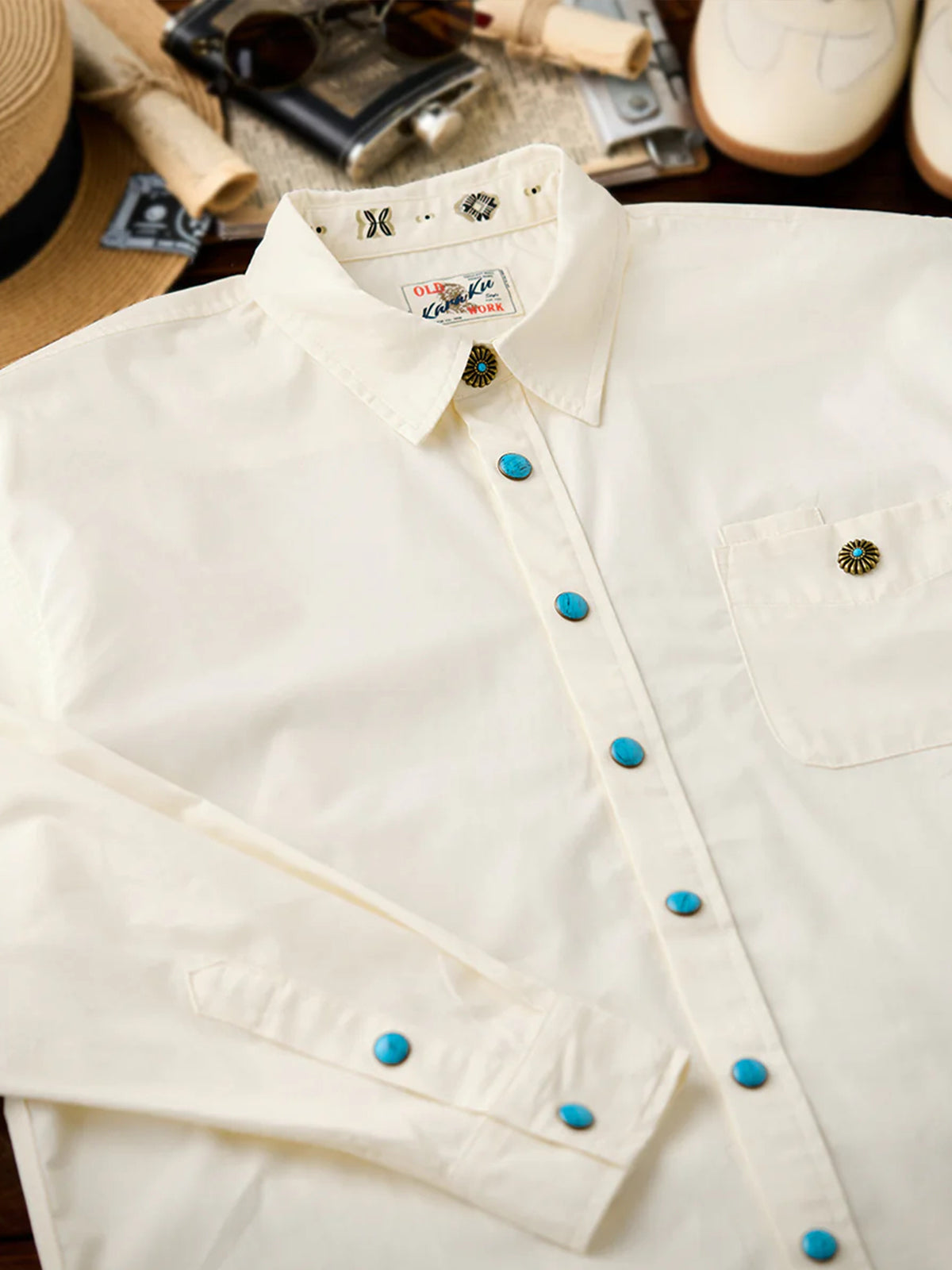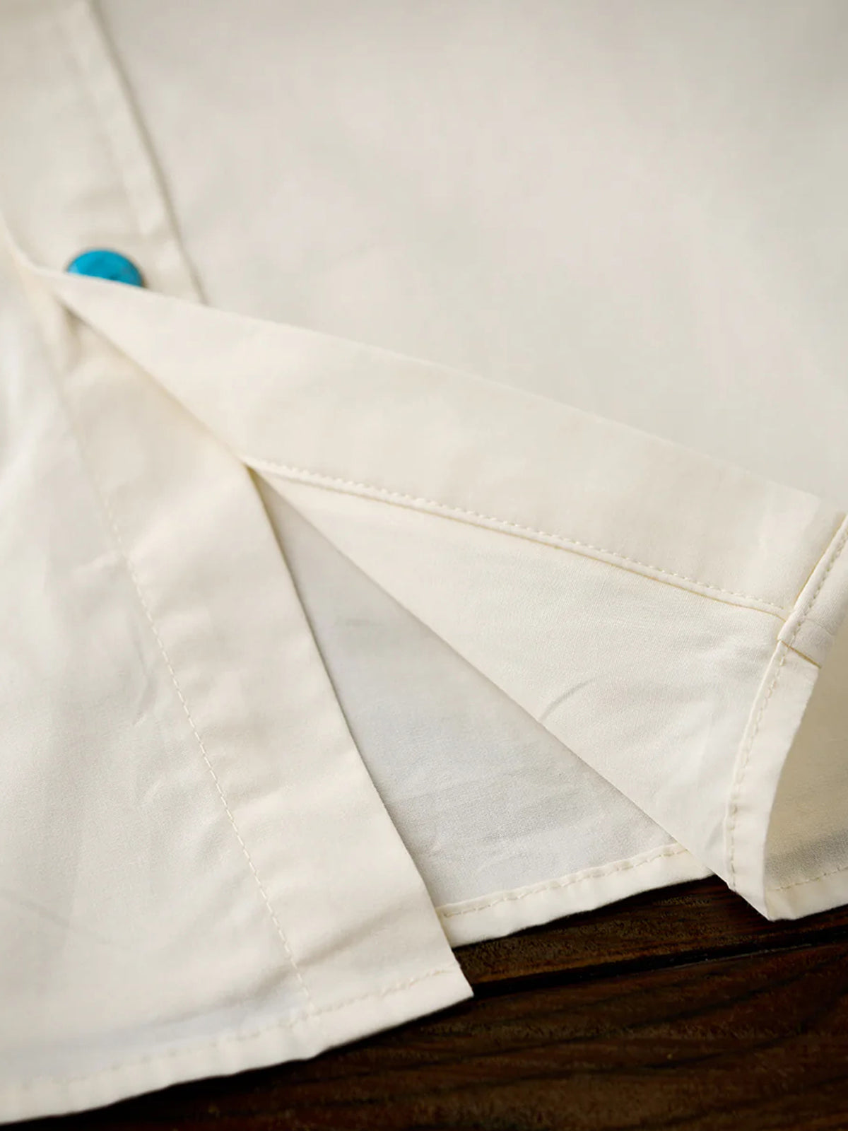 The buttons on the left breast pocket are also made of turquoise metal buttons, surrounded by antique gold and silver frames. The same button design is used on the center line of the front, cuffs and collar to create a sense of unity. The back yoke is embroidered with a design of two crossed arrows, and black and dark gray threads are used to emphasize the soft tones of the entire shirt.