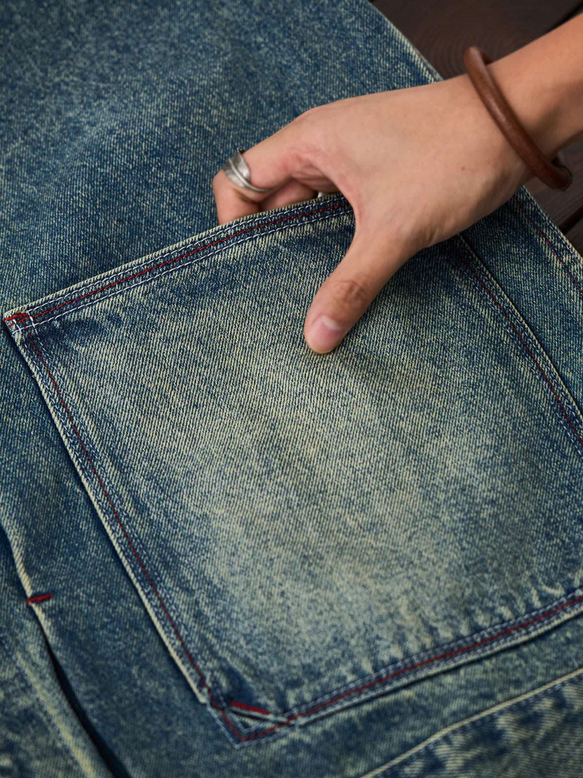 Stonewashing is the process of washing denim using stones and special abrasives to soften the texture and create a natural fading and brushed feel on the surface of the denim. It creates a vintage and classic atmosphere. Two patch pockets are set on the front, which is both tasteful and practical. It has a light and tight silhouette and fits the body moderately. It has sharp lines and three-dimensional cutting.