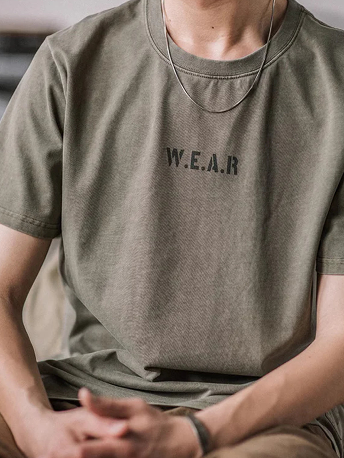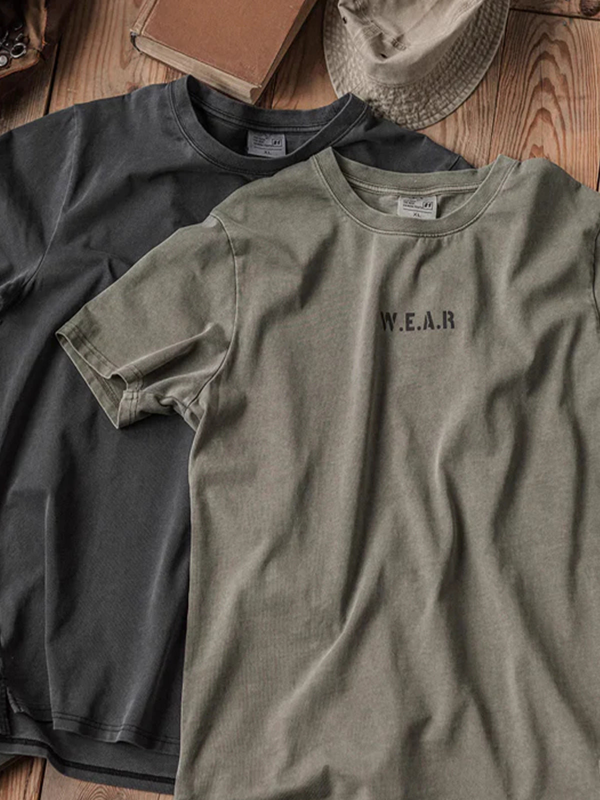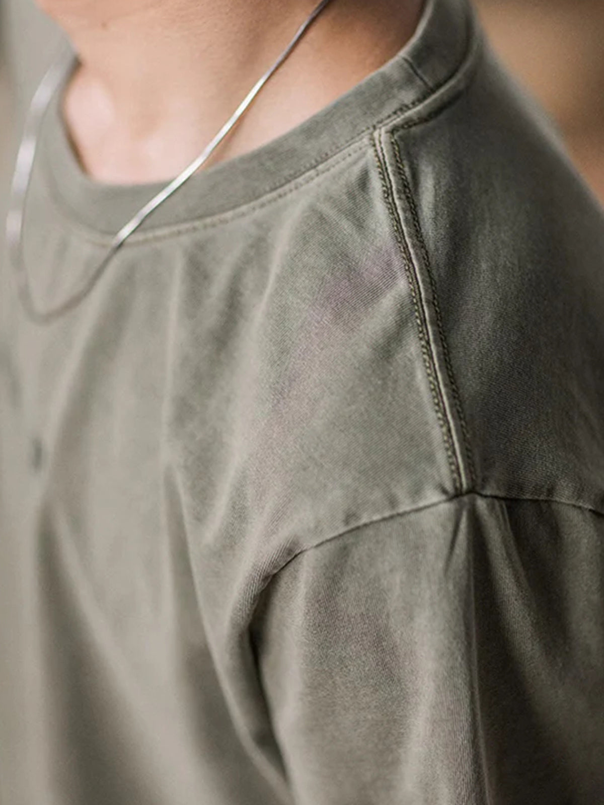 A masculine vintage T-shirt is here! After enzyme washing, it has a delicate fading and vintage texture, making it an item that you can enjoy more fading when wearing it. The regular fit has a perfect silhouette, and the casual side slits not only widen the range of motion, but also serve as a coordination point, making it an indispensable item for fashionable layering in summer. It is available in two colors: military green with a military feel and stylish classic gray.