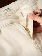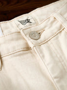 The front has a custom zipper placket and button closure, and the design is simple and practical. There are five pockets in total (two front pockets, a coin pocket and two back pockets) on the front and back, following the design of traditional jeans. The leather back patch at the waist highlights the brand's personality. The overall slim silhouette design fits the foot shape, giving a fashionable and modern feel. With a tapered cut that tapers to the hem, the effect is to make the legs look thinner and longer. The fabric is made of cotton, combined with a unique color with a concave and convex feel, using off-white instead of pure white, giving it a sophisticated retro feel.