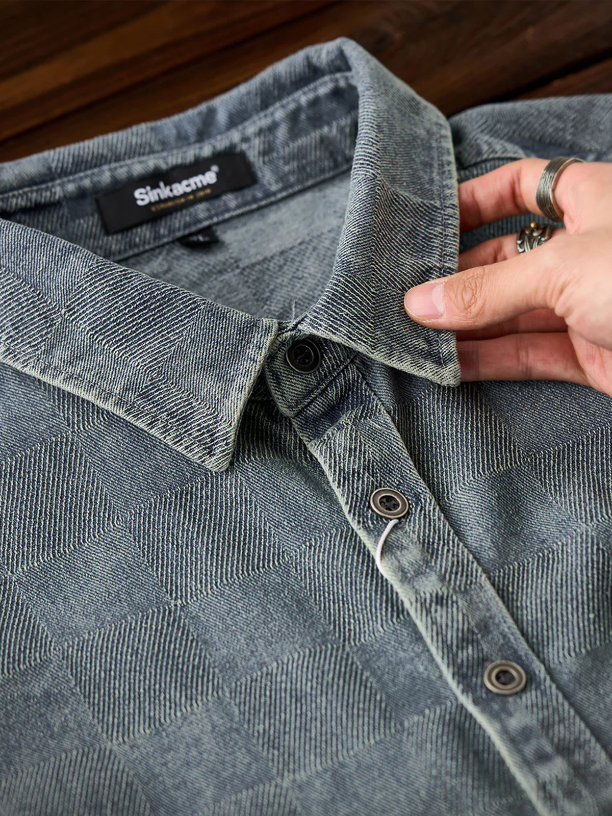 The entire area is designed with a checkered weave, and the pattern created by the weaving creates a casual three-dimensional luxury feel. The design on the front is simple without any additional decoration, giving an elegant impression. A pocket is used to store the typical practical details of a work shirt. The sleeves are slightly longer and have button cuffs that fit the wrist. The hem is designed with a round cut to create a natural style.