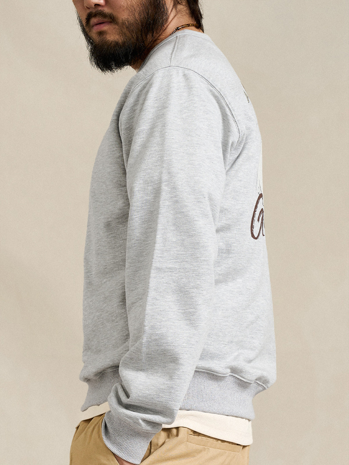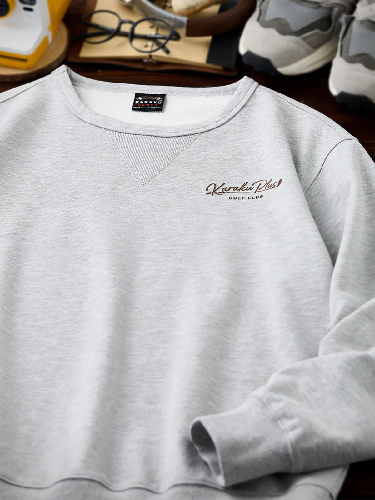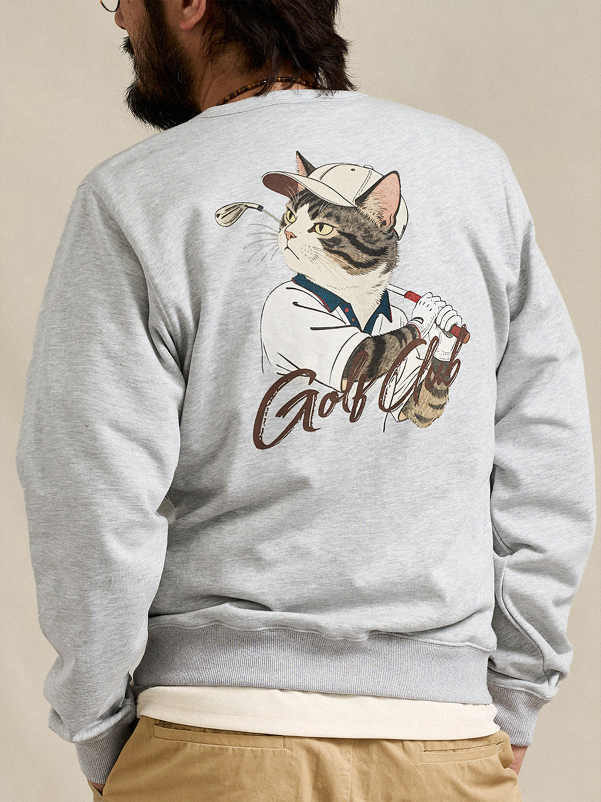 A simple logo print is placed on the front for a clean, understated look. The V-gusset detail at the neckline incorporates a traditional element of classic sweatshirts, balancing design appeal with functionality. On the back, a bold graphic depicts a cat wearing a hat turning mid-golf swing, capturing a moment full of movement and energy. The playful illustration adds humor and a sense of story to the piece. Designed with a basic silhouette, it works well worn on its own or layered under outerwear, making it an ideal sweatshirt for adding subtle character to casual outfits.