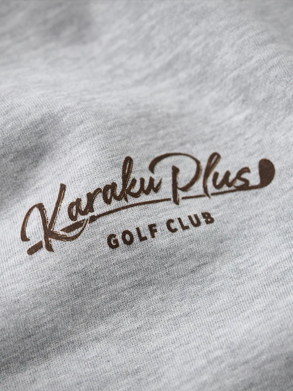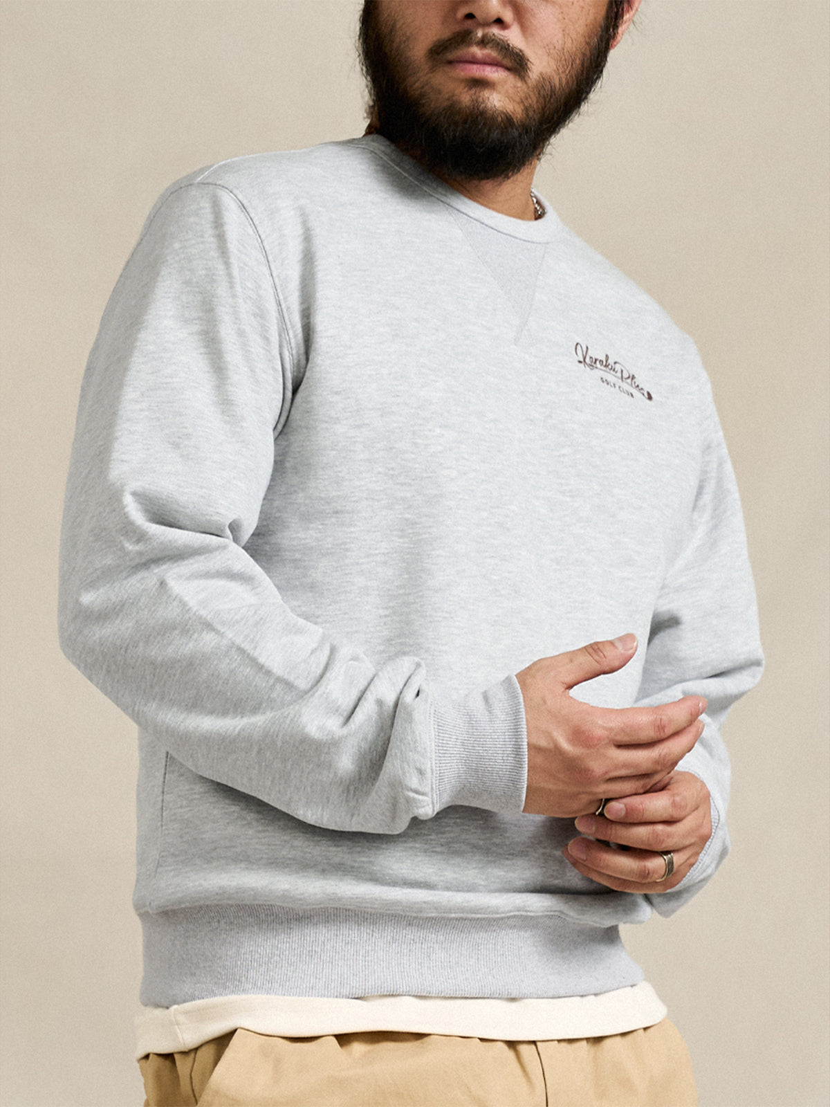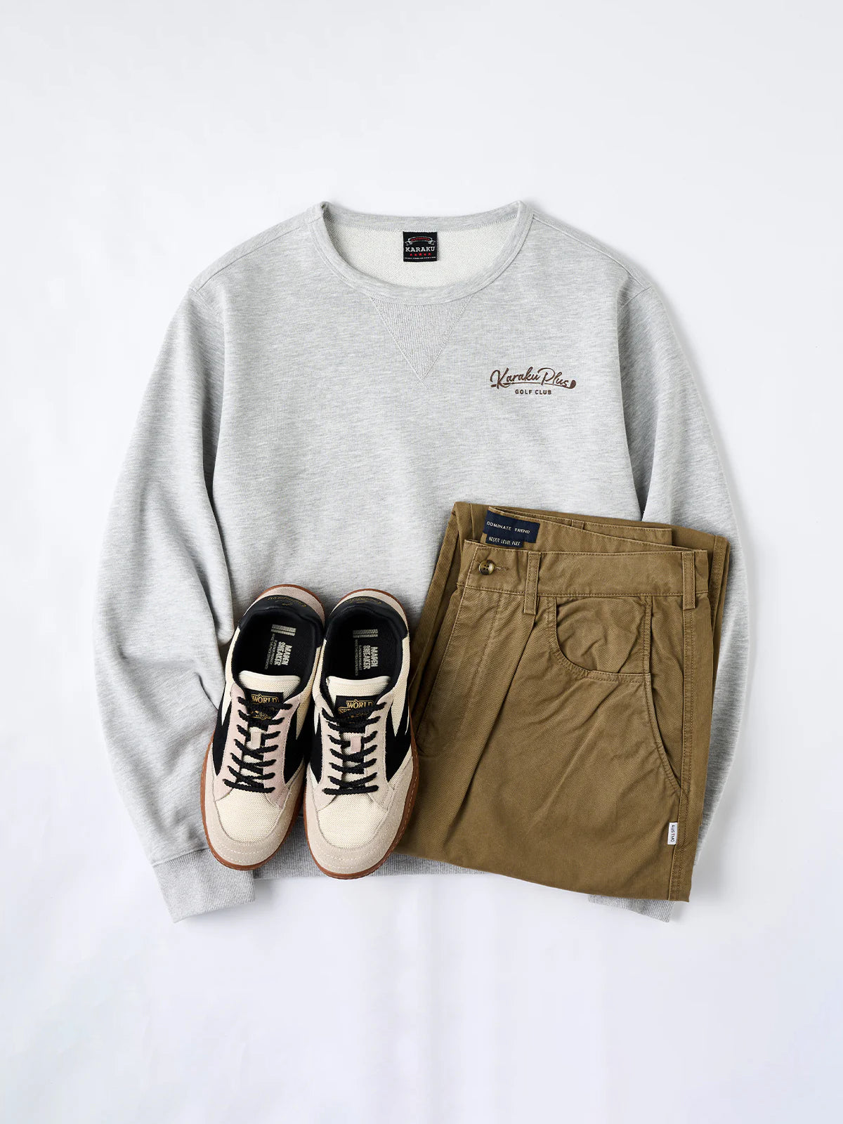 A simple logo print is placed on the front for a clean, understated look. The V-gusset detail at the neckline incorporates a traditional element of classic sweatshirts, balancing design appeal with functionality. On the back, a bold graphic depicts a cat wearing a hat turning mid-golf swing, capturing a moment full of movement and energy. The playful illustration adds humor and a sense of story to the piece. Designed with a basic silhouette, it works well worn on its own or layered under outerwear, making it an ideal sweatshirt for adding subtle character to casual outfits.