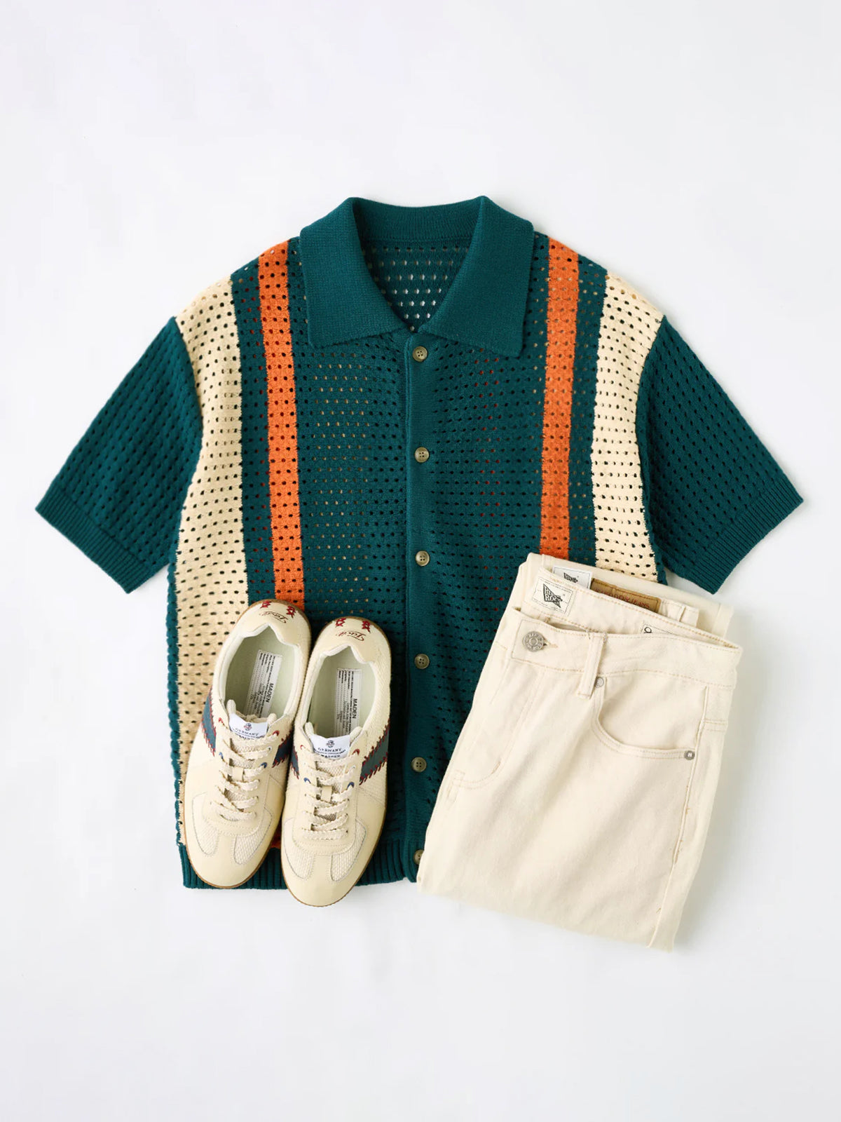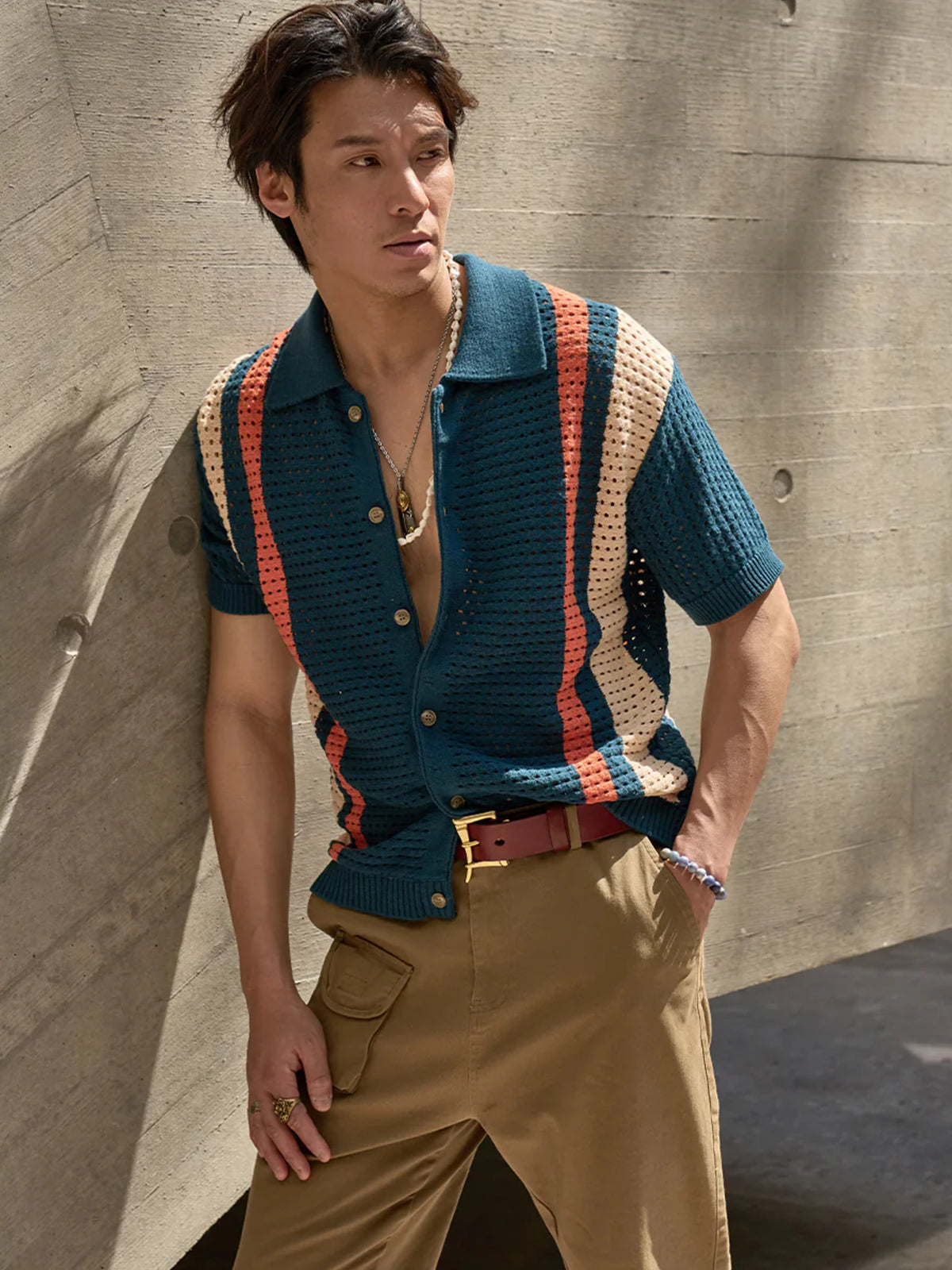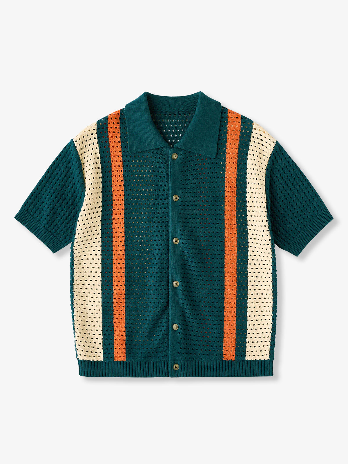 An elegant and sophisticated knit shirt that combines delicate hollow lace and colorful stripes. The delicate transparency creates a sense of lightness, and it has both independence and layering style. Soft and stretchy knit material, comfortable to wear. This is a design that gives a modern impression while having a classical atmosphere, active in a wide range of scenes from casual to formal.