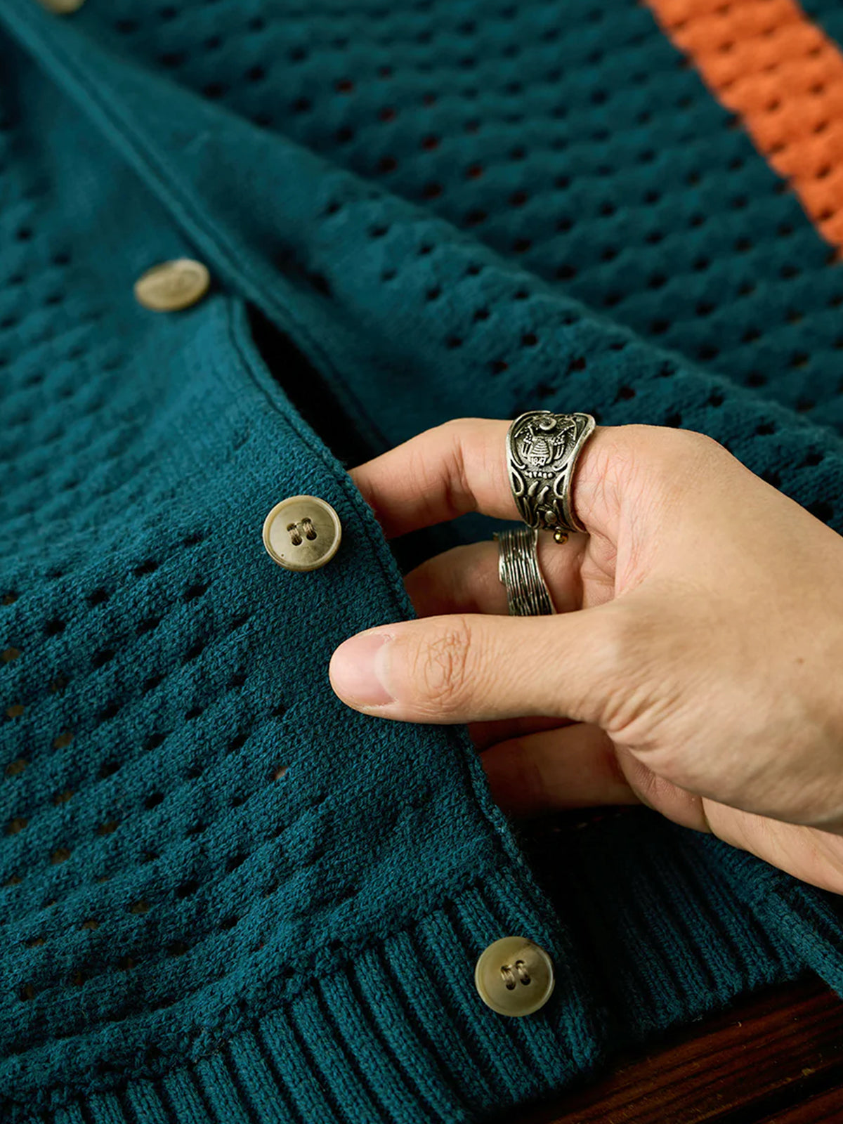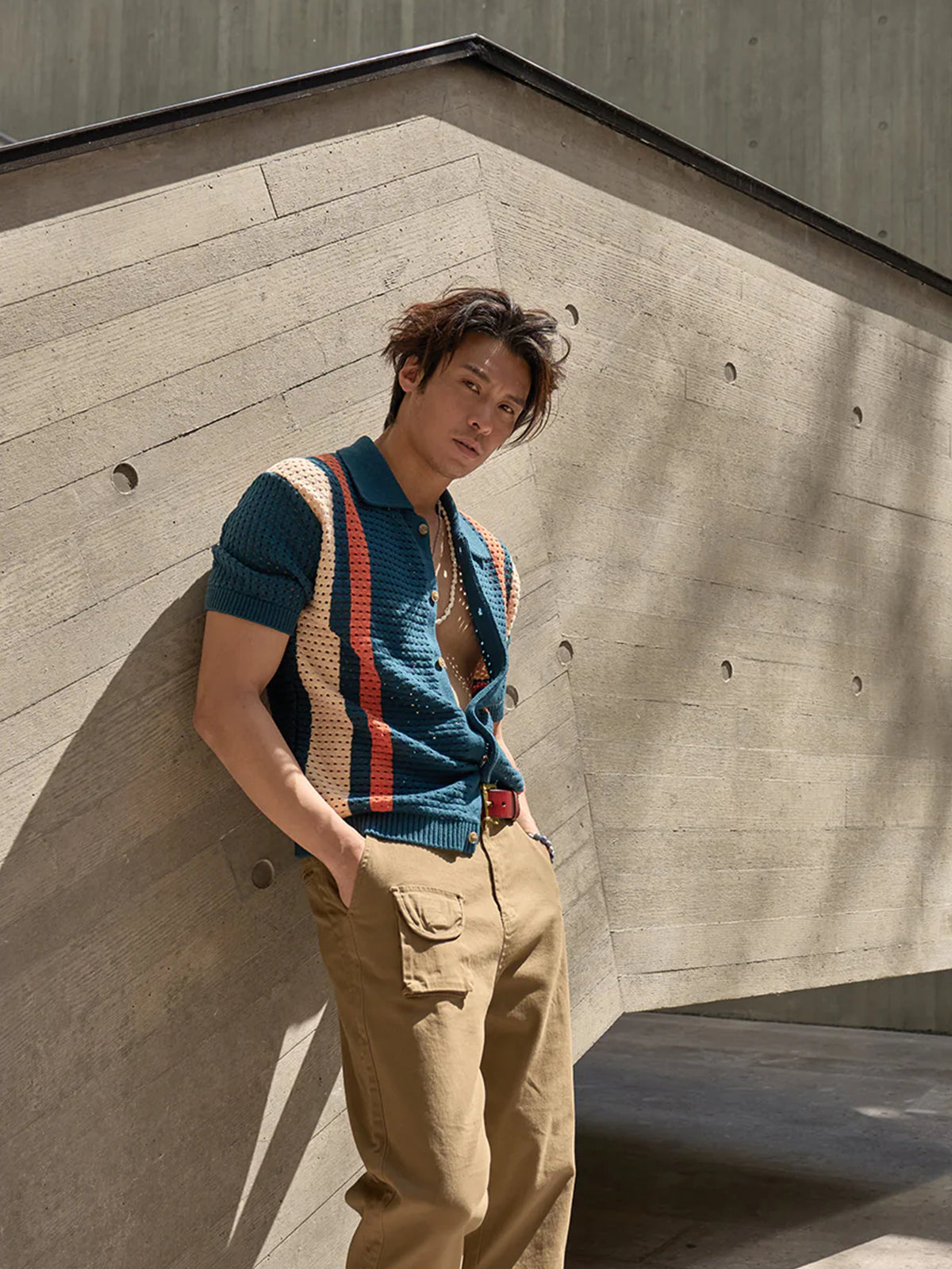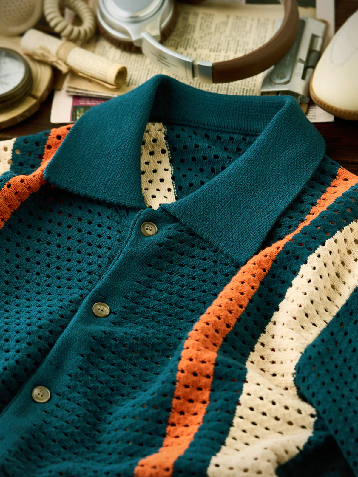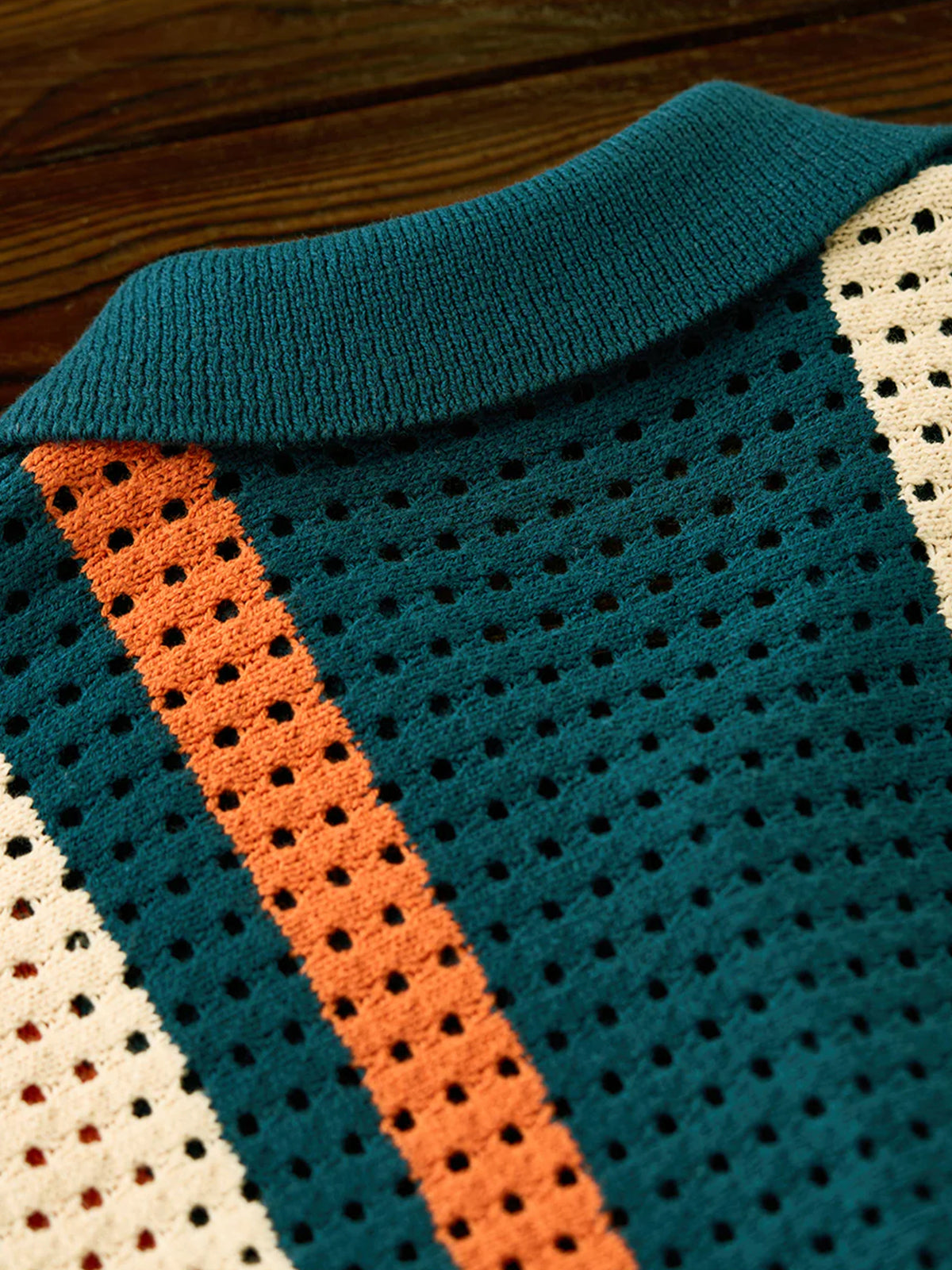 An elegant and sophisticated knit shirt that combines delicate hollow lace and colorful stripes. The delicate transparency creates a sense of lightness, and it has both independence and layering style. Soft and stretchy knit material, comfortable to wear. This is a design that gives a modern impression while having a classical atmosphere, active in a wide range of scenes from casual to formal.