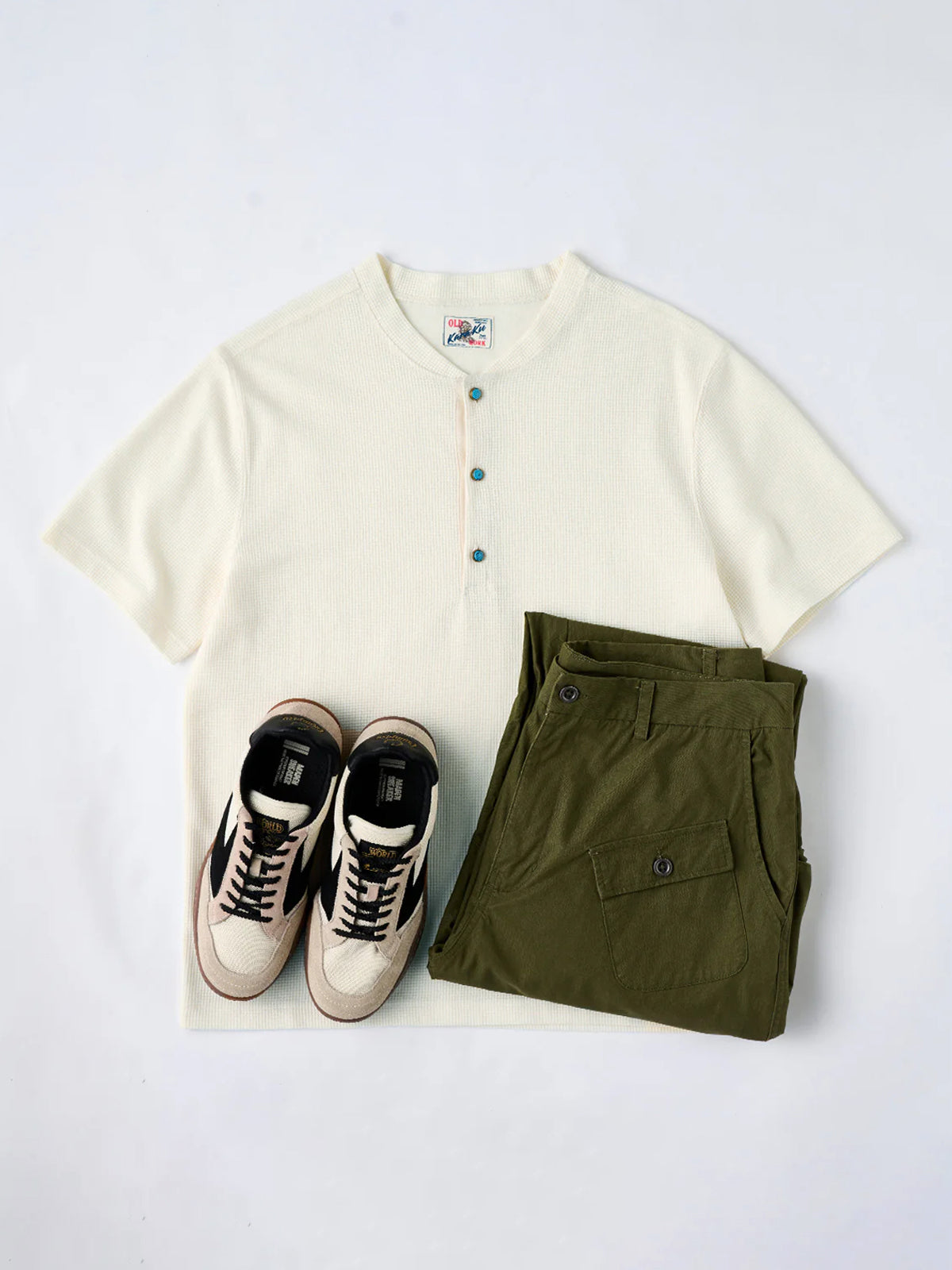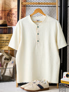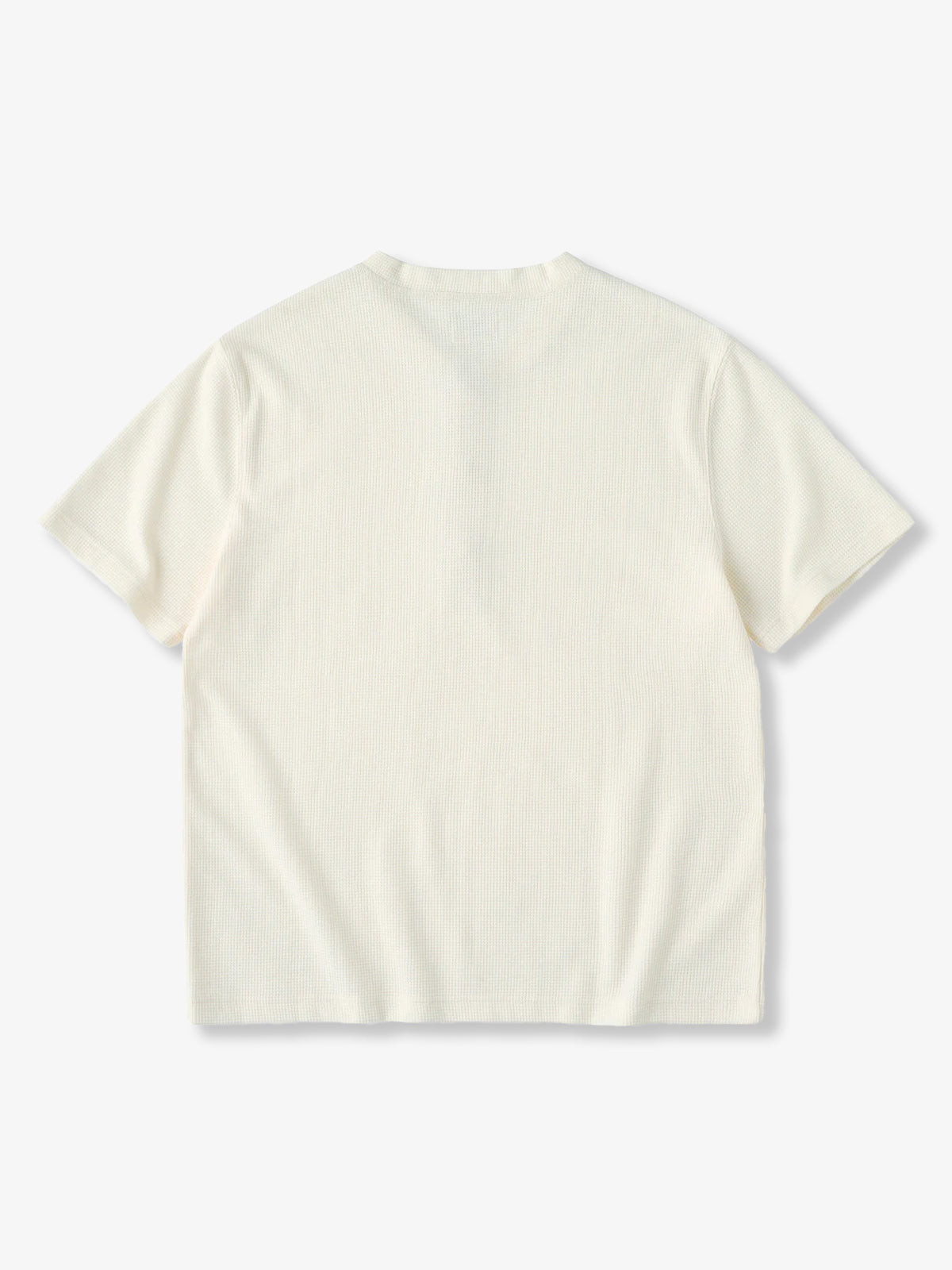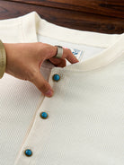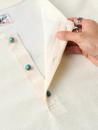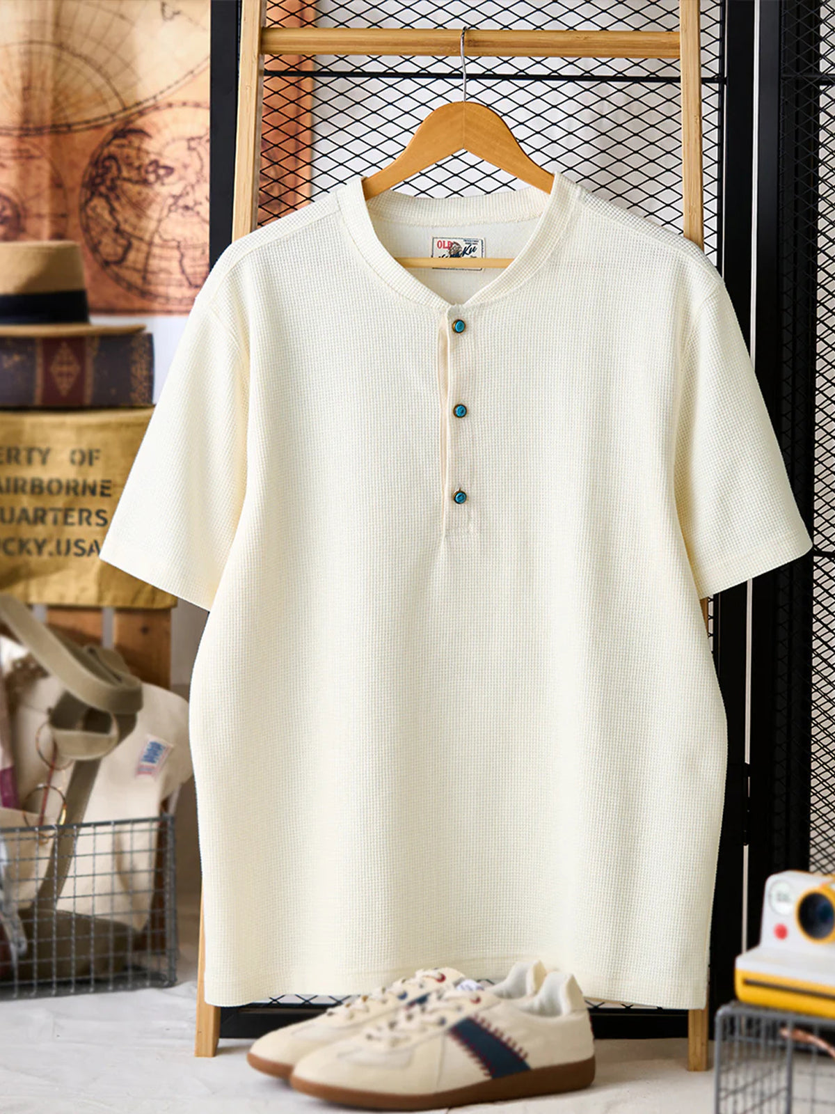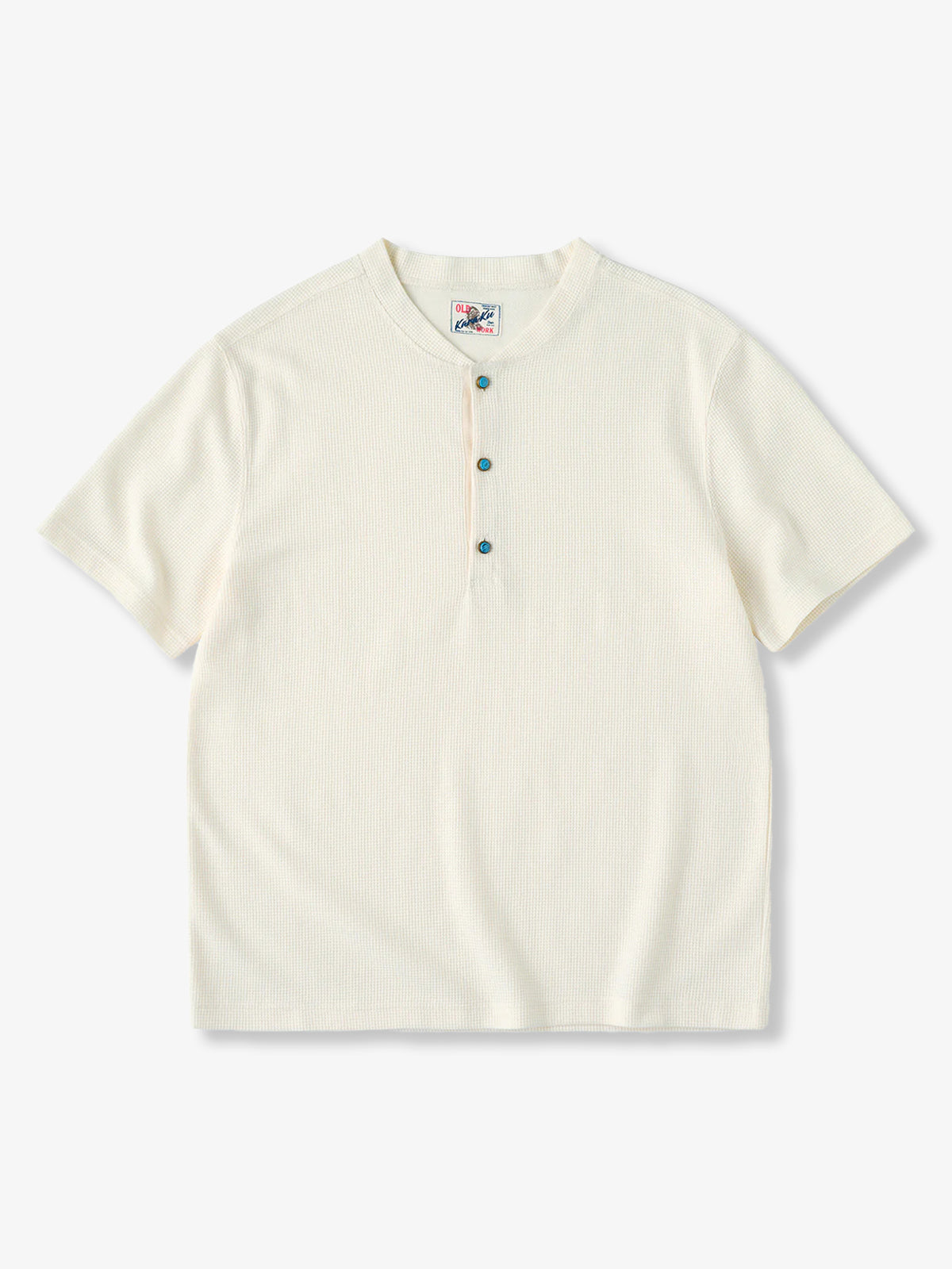 A Henry collar T-shirt made of waffle fabric, which is soft to the touch, extremely breathable, and comfortable to wear. The front is decorated with turquoise metal buttons. The buttons are surrounded by an antique gold frame, giving a subtle yet strong accent. Although it is basic, it is a design that pays attention to detail and is a piece that can even be designed as a single piece. It complements casual, American, and outdoor styles, and is suitable not only for spring and summer, but also for layering in early autumn.