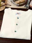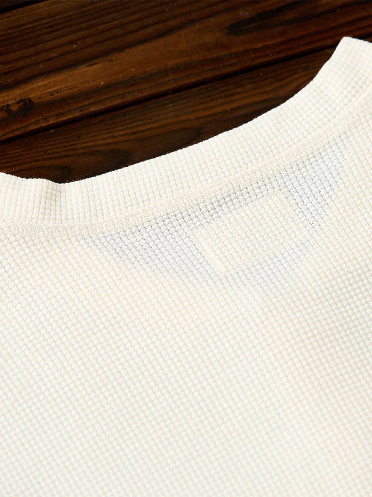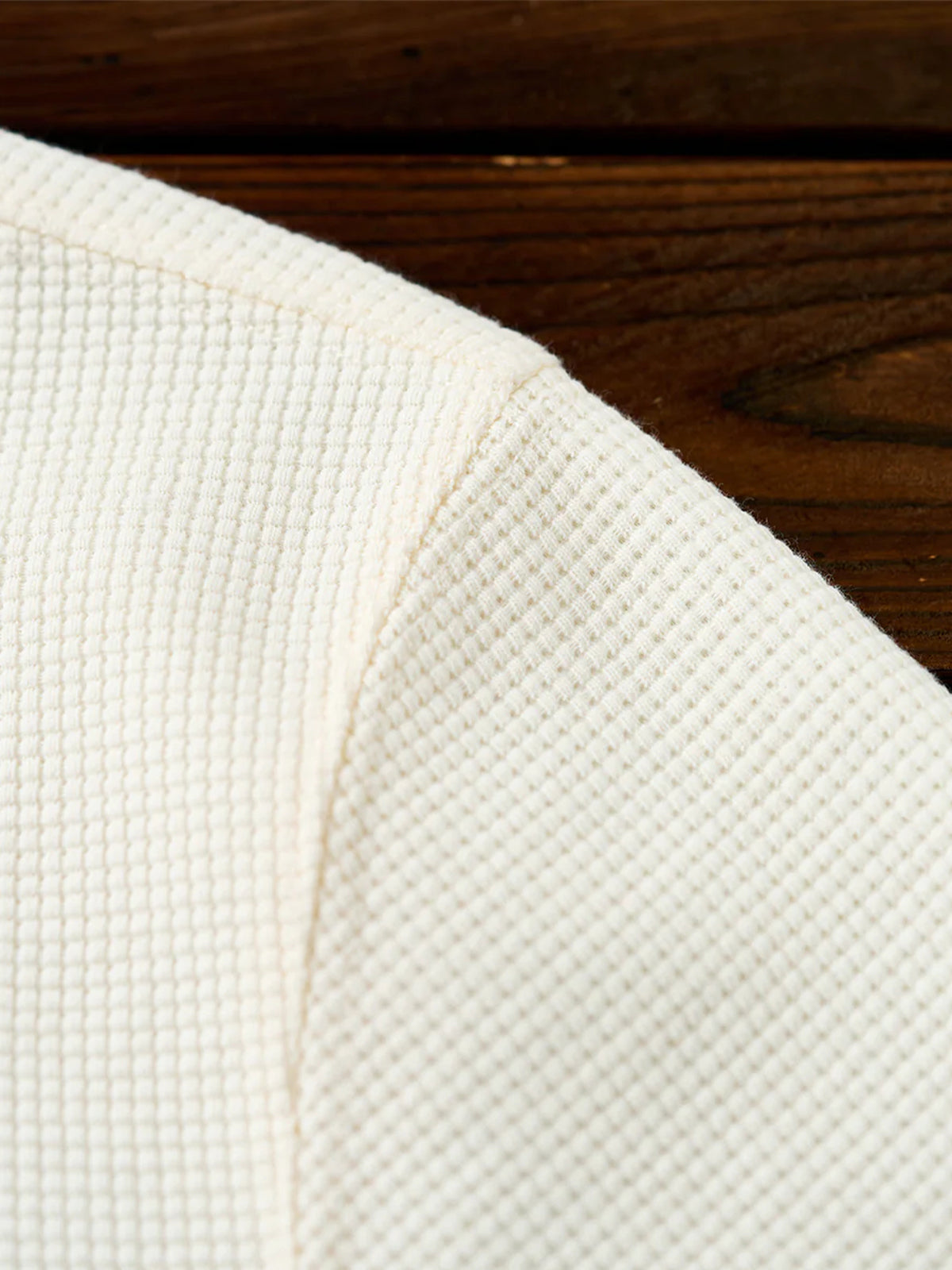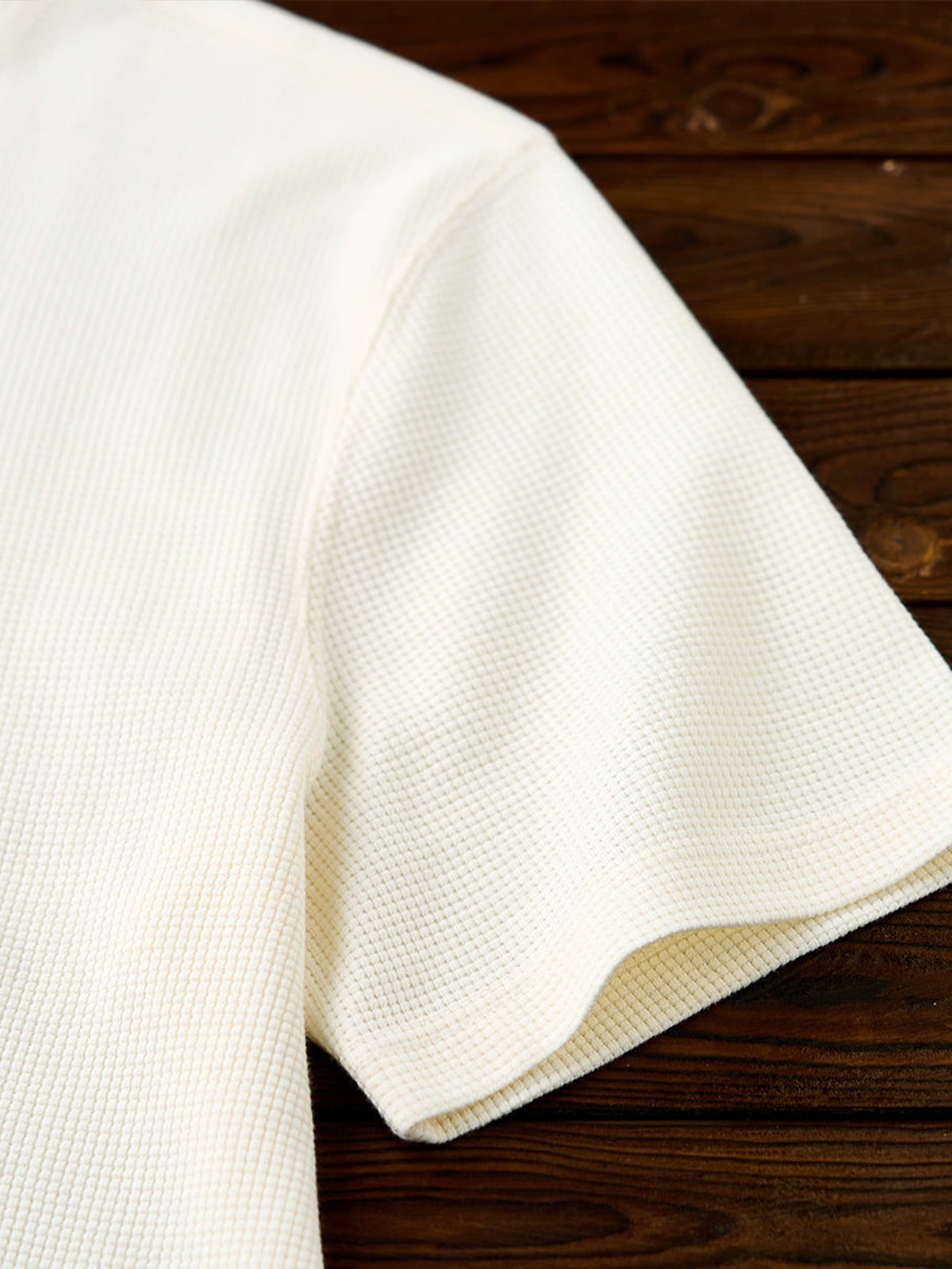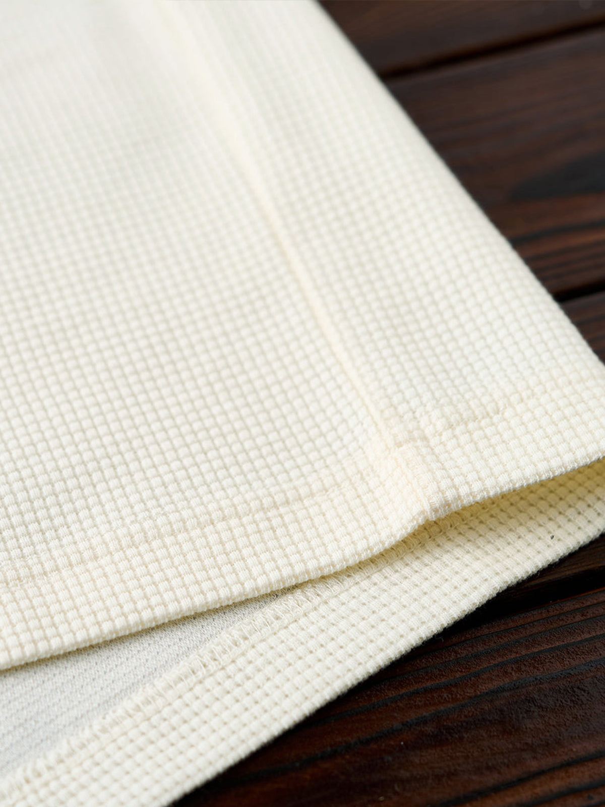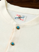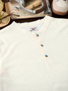 A Henry collar T-shirt made of waffle fabric, which is soft to the touch, extremely breathable, and comfortable to wear. The front is decorated with turquoise metal buttons. The buttons are surrounded by an antique gold frame, giving a subtle yet strong accent. Although it is basic, it is a design that pays attention to detail and is a piece that can even be designed as a single piece. It complements casual, American, and outdoor styles, and is suitable not only for spring and summer, but also for layering in early autumn.