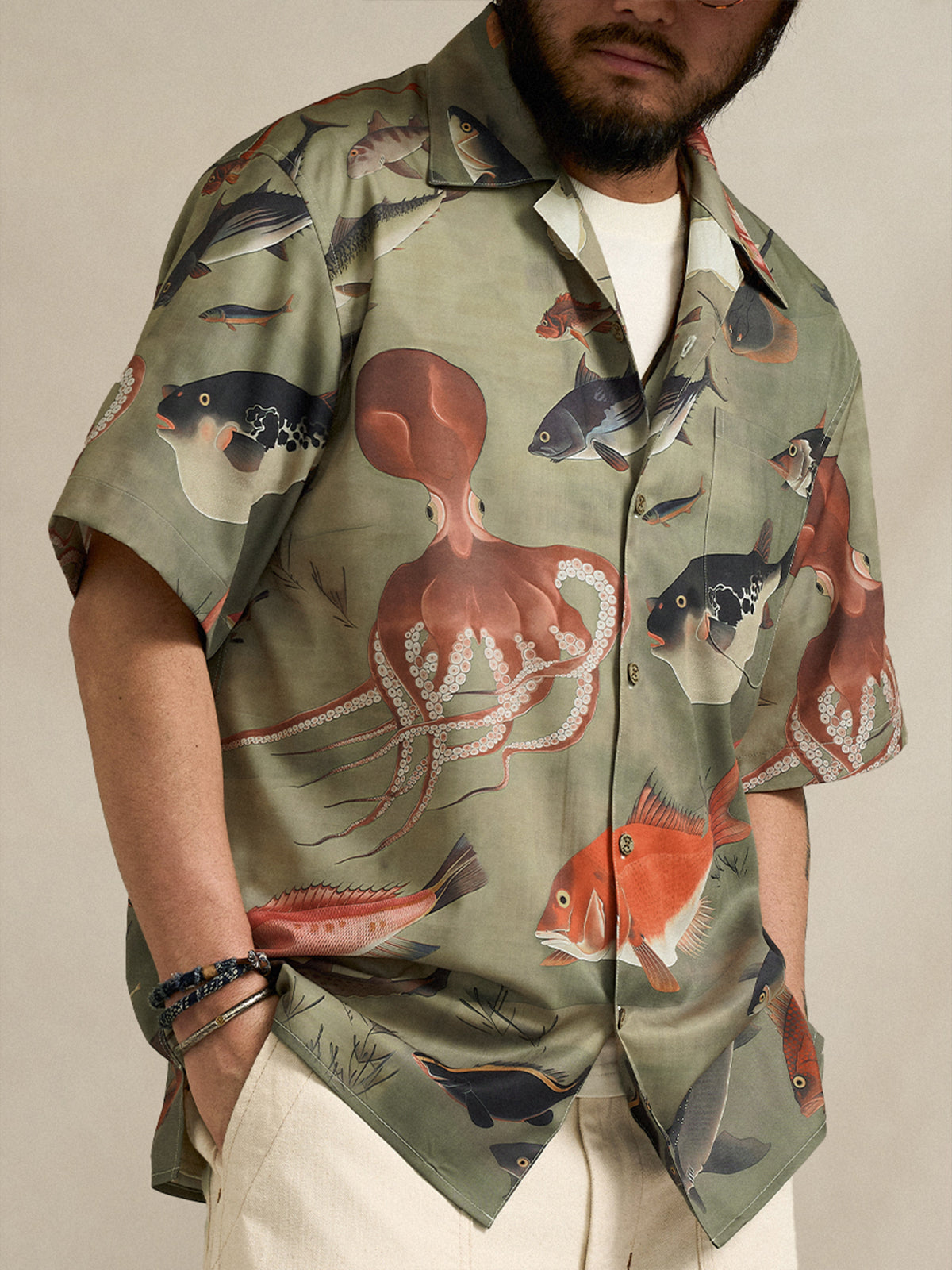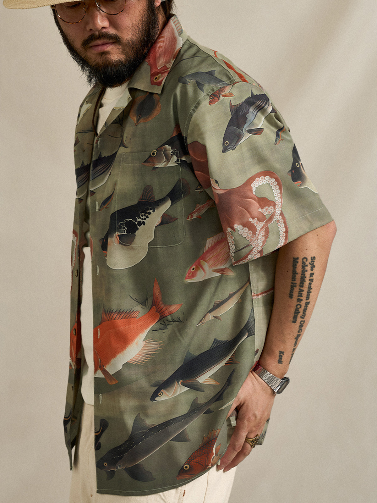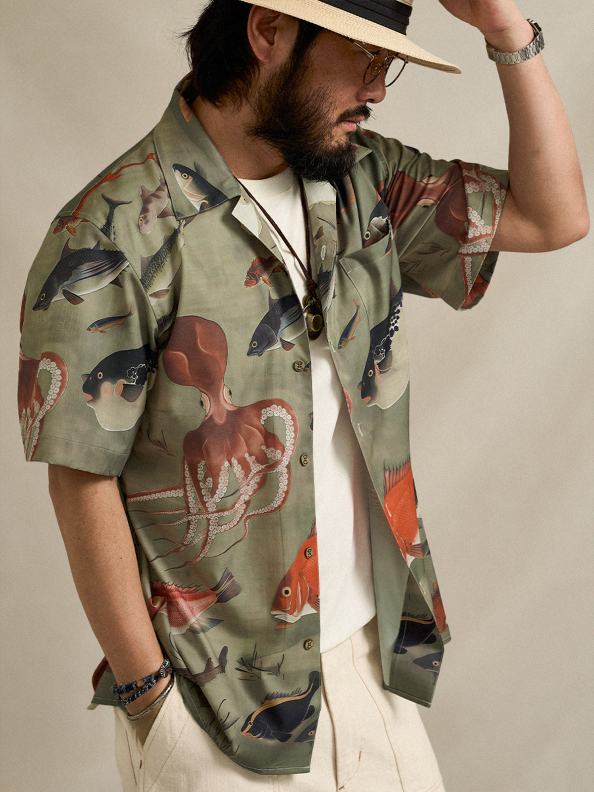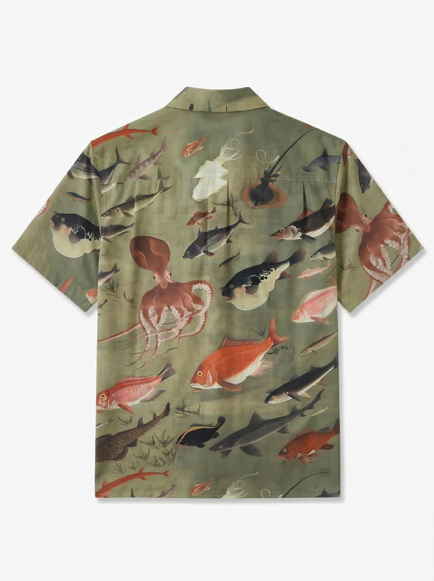 Ito Jakuchu “Group of Fish” Print Open-Collar Aloha Shirt