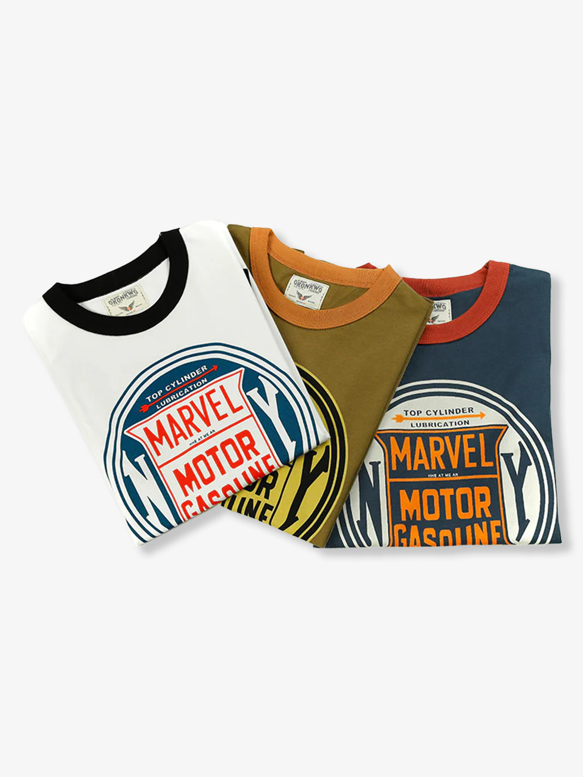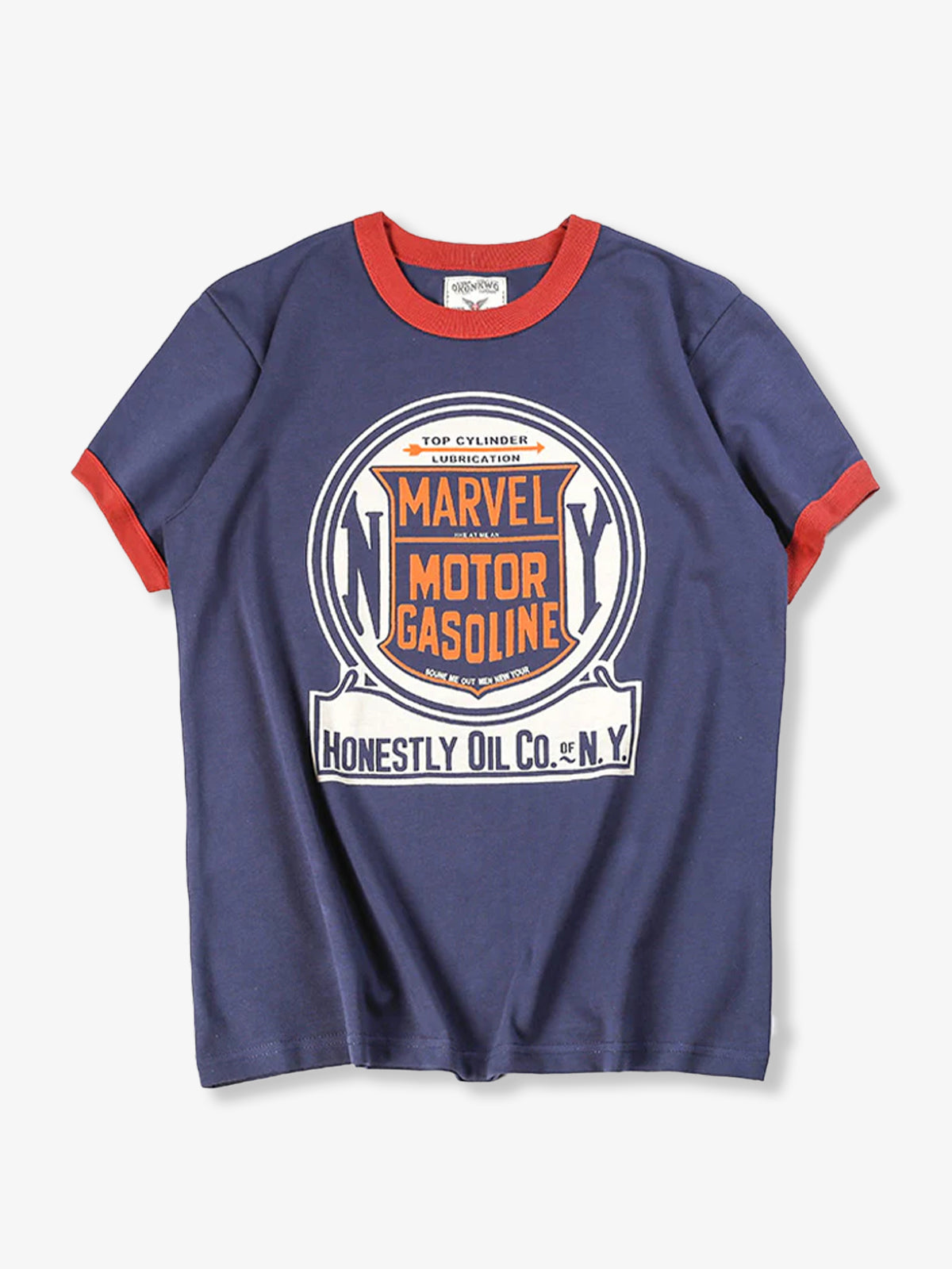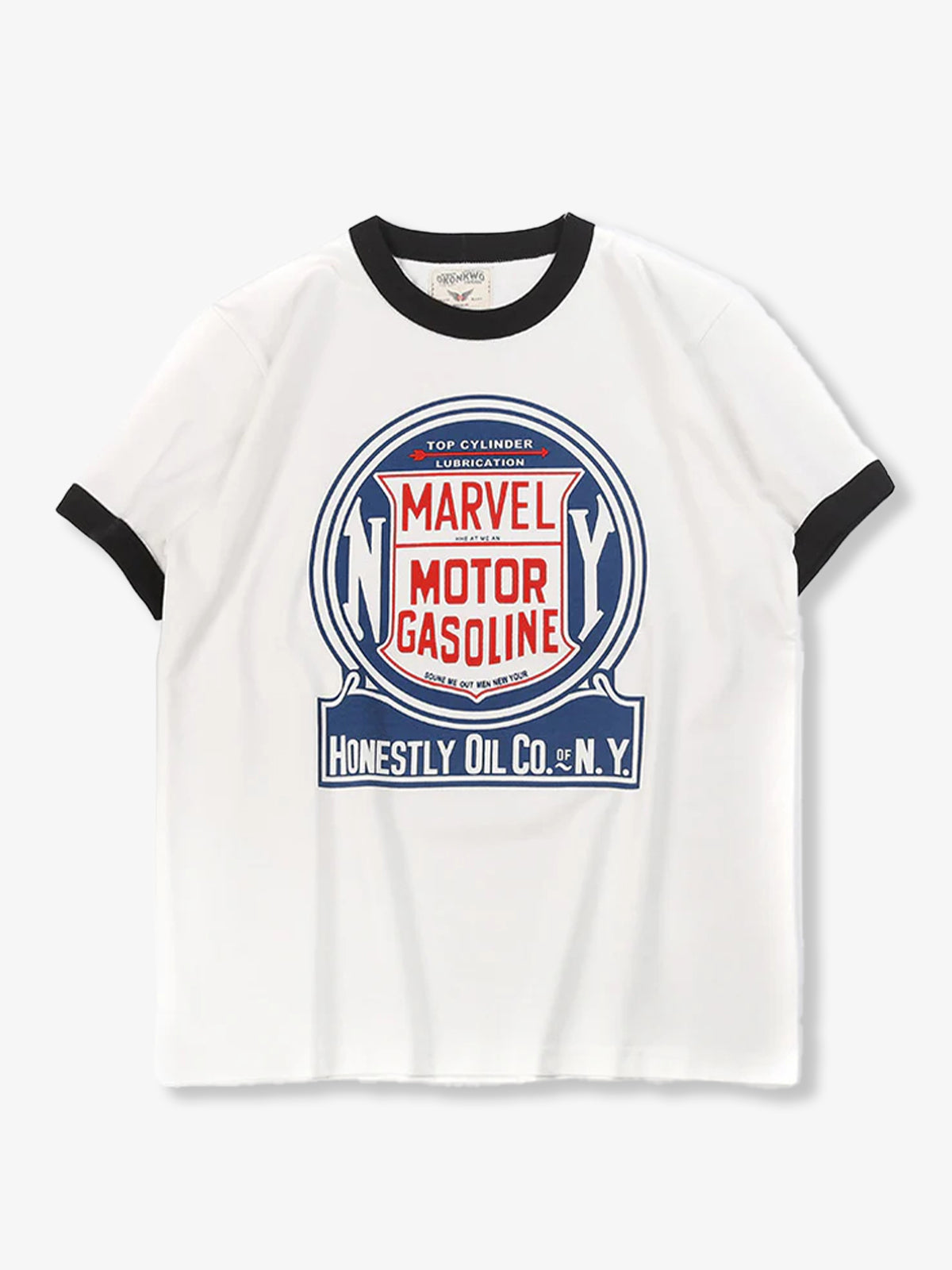The collar and sleeve edges are decorated with colorful ribbing! Ringer T-shirts are T-shirts with piping on the neck and sleeves. The English word "ring", which means "ring", derives the name Ringer T-shirt. Decorated with Marvel Motor Gasoline prints, American style and street style embellish retro clothing design, fashionable and mature. It is also recommended to buy it as an unusual piece in a large T-shirt series, and it complements retro lovers and the current popular second-hand clothing combination.
