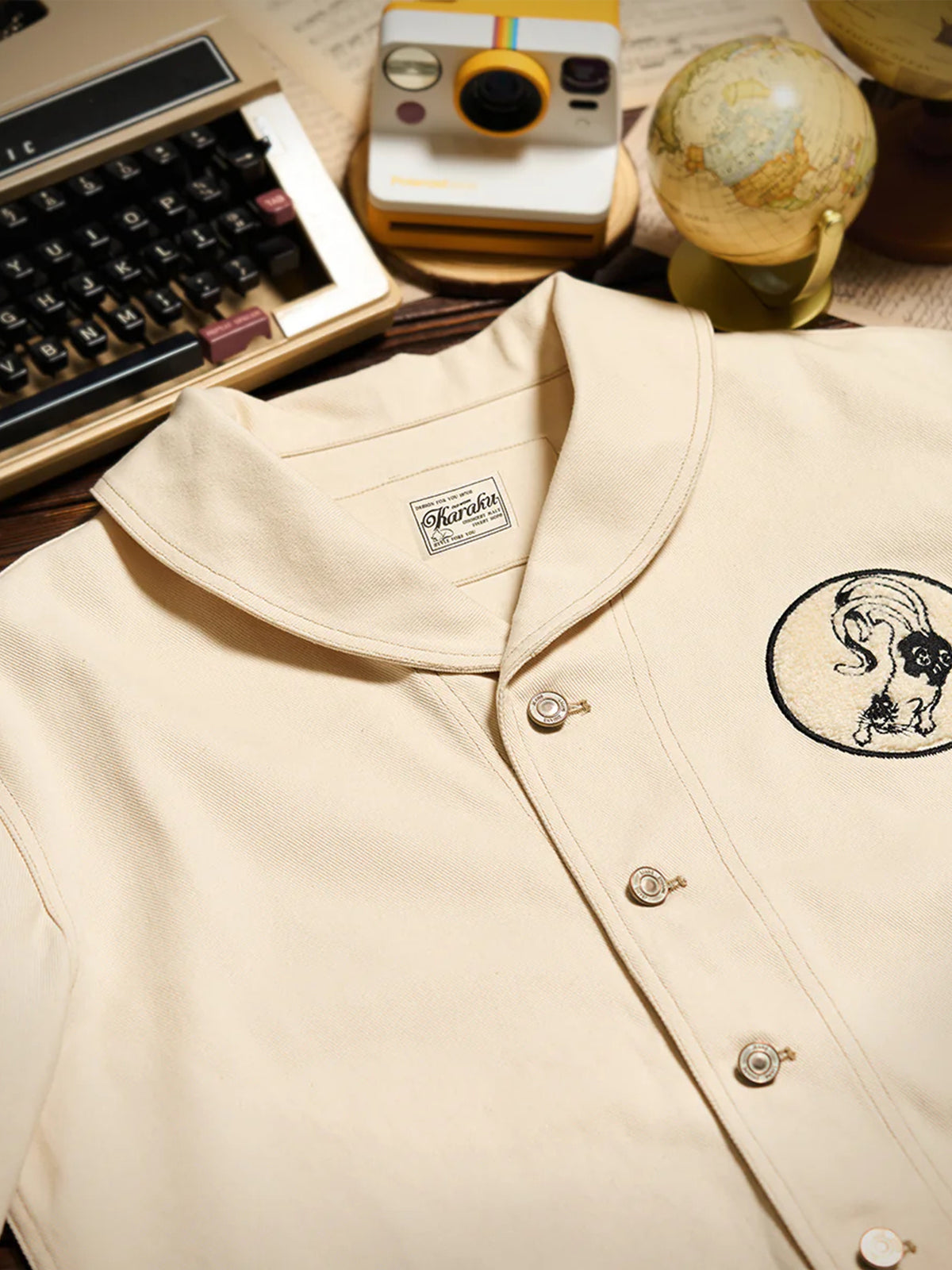 This shawl collar denim coverall fuses the practicality of American workwear with the aesthetics of traditional Japanese ukiyo-e art. The Sagara embroidery of the Nekomata boldly portrays this legendary yokai, leaving a strong impression. Thoughtful craftsmanship is evident throughout the design, adding a unique story to your everyday outfit. By combining traditional motifs with modern interpretation, it brings individuality to contemporary fashion. Made with durable denim fabric, this piece is built to last. A one-of-a-kind jacket blending classic style with modern edge.