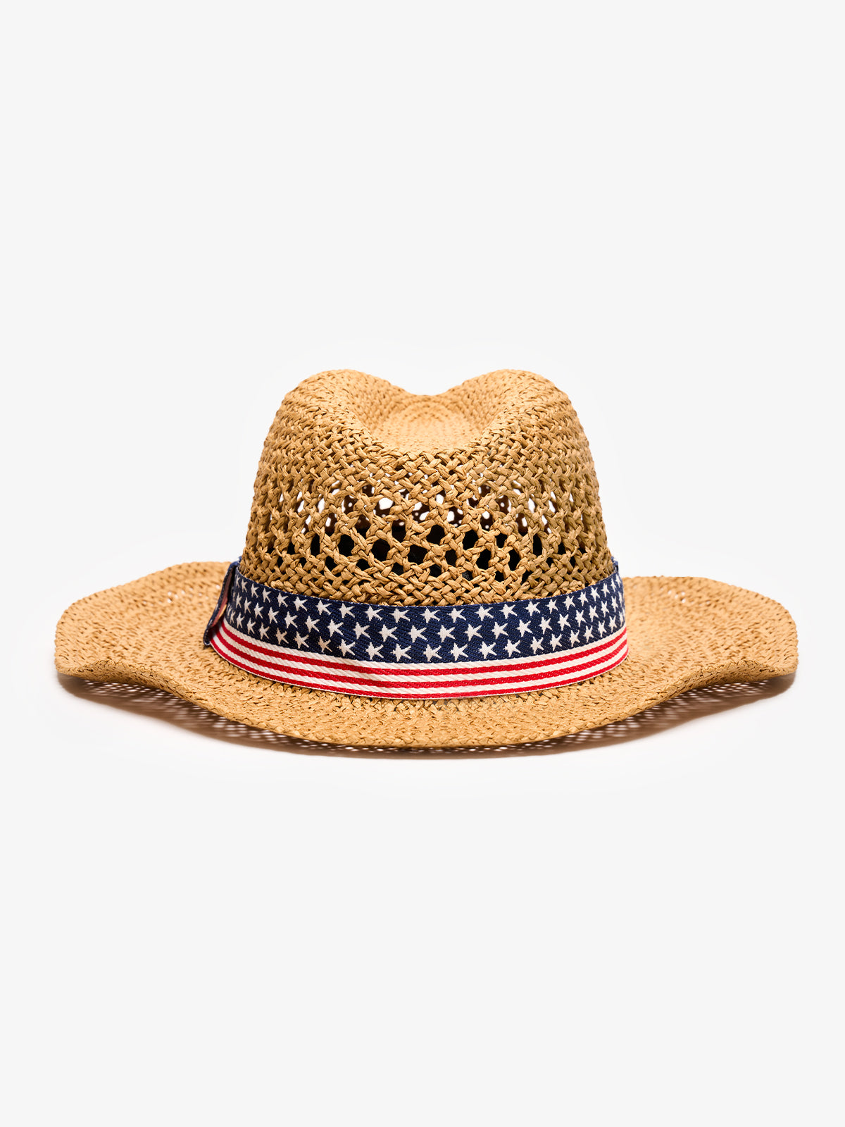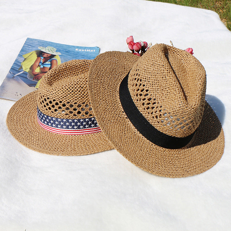 This hand-woven hollow straw hat is accented with an American flag band, showcasing classic American style. Ideal for patriotic events or casual wear, it adds a distinctive touch to any outfit.