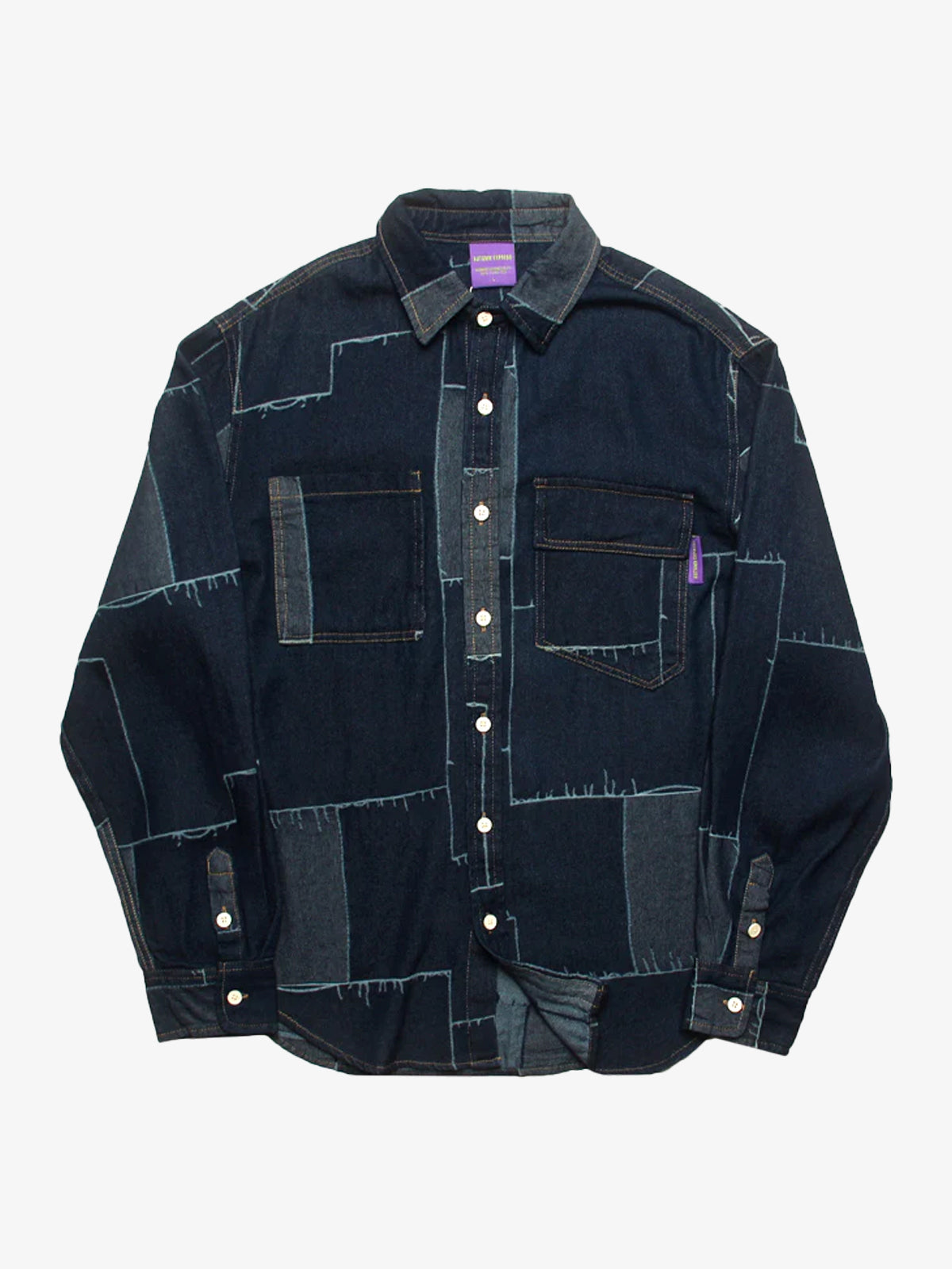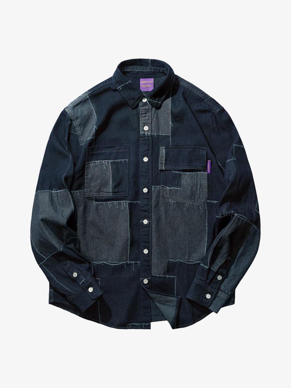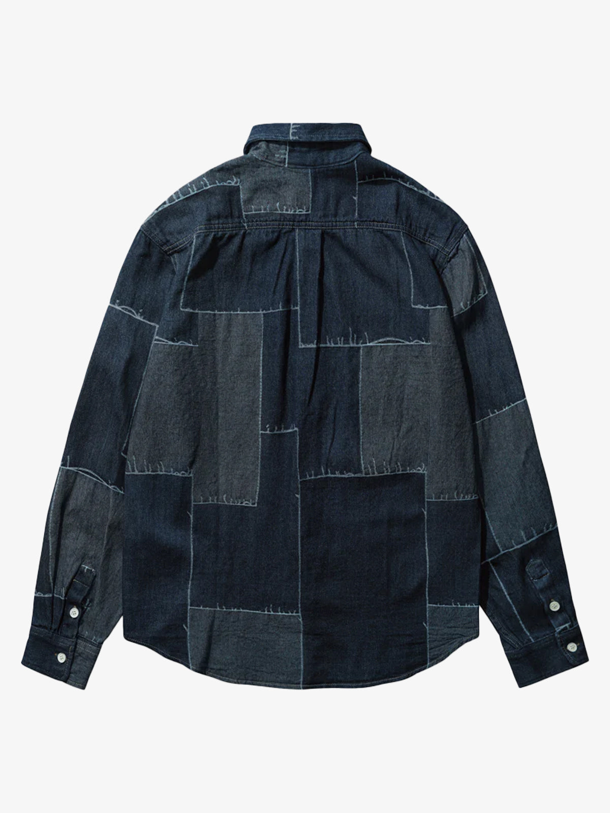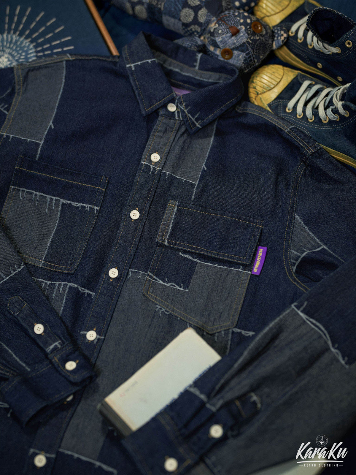 This vintage-inspired patchwork denim shirt features a unique two-tone design with indigo hues, creating a stylish and eye-catching look. Made from 100% cotton with a washed finish, it offers a soft feel and comfortable drape. The relaxed fit, with asymmetric pockets and a rounded hem, allows for versatile styling. Perfect as a standalone piece or layered over a tee for a fresh, casual look.