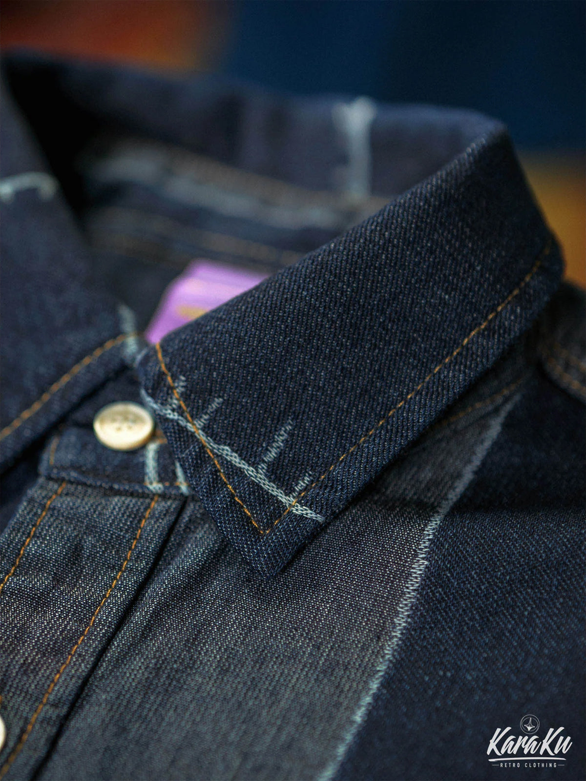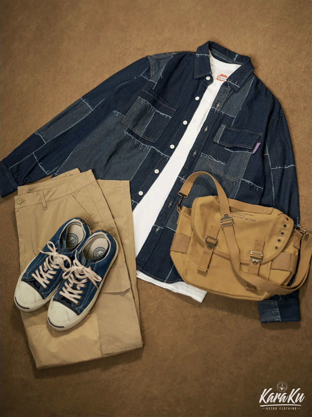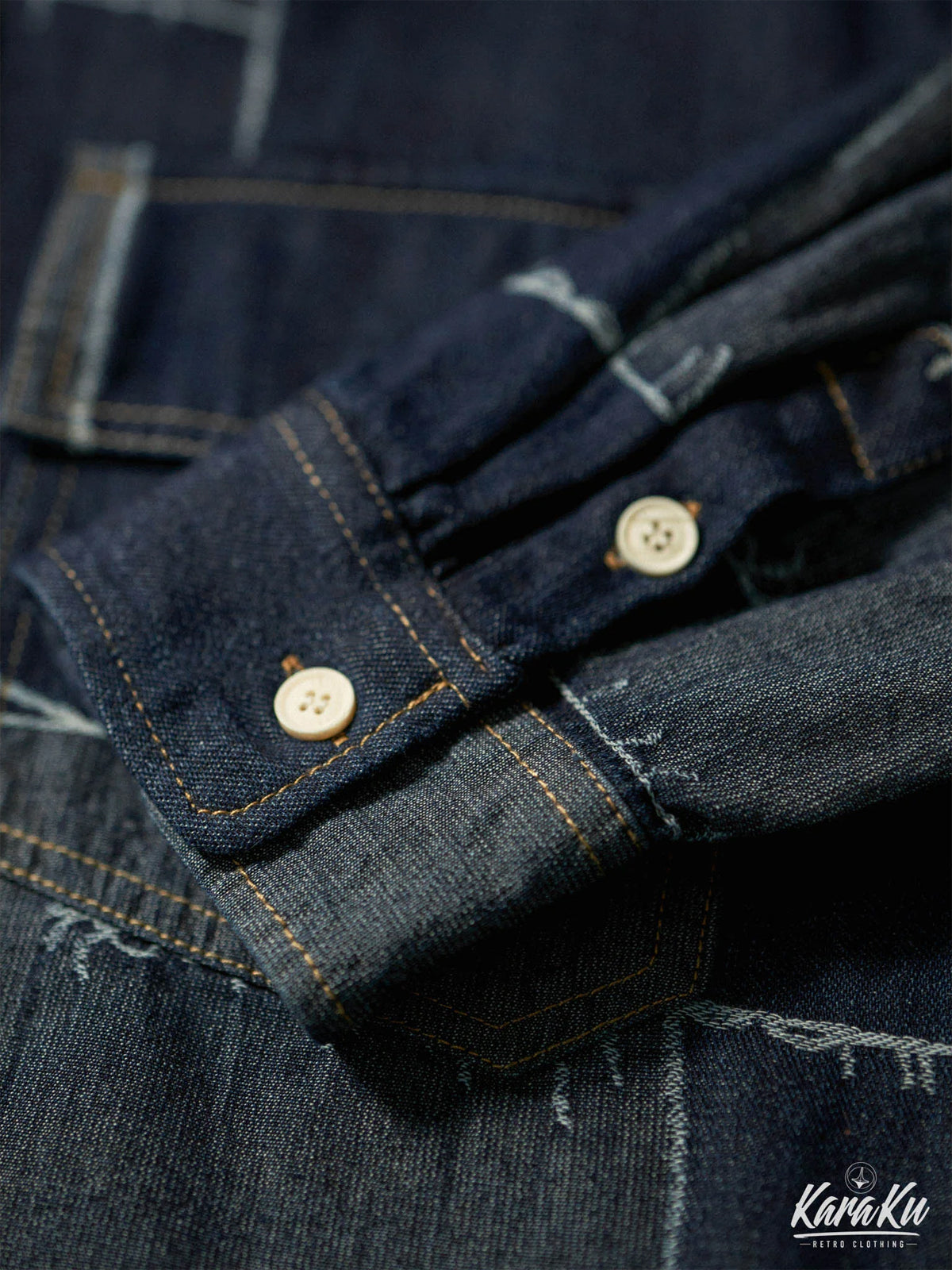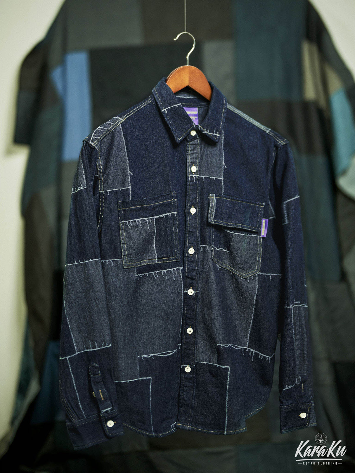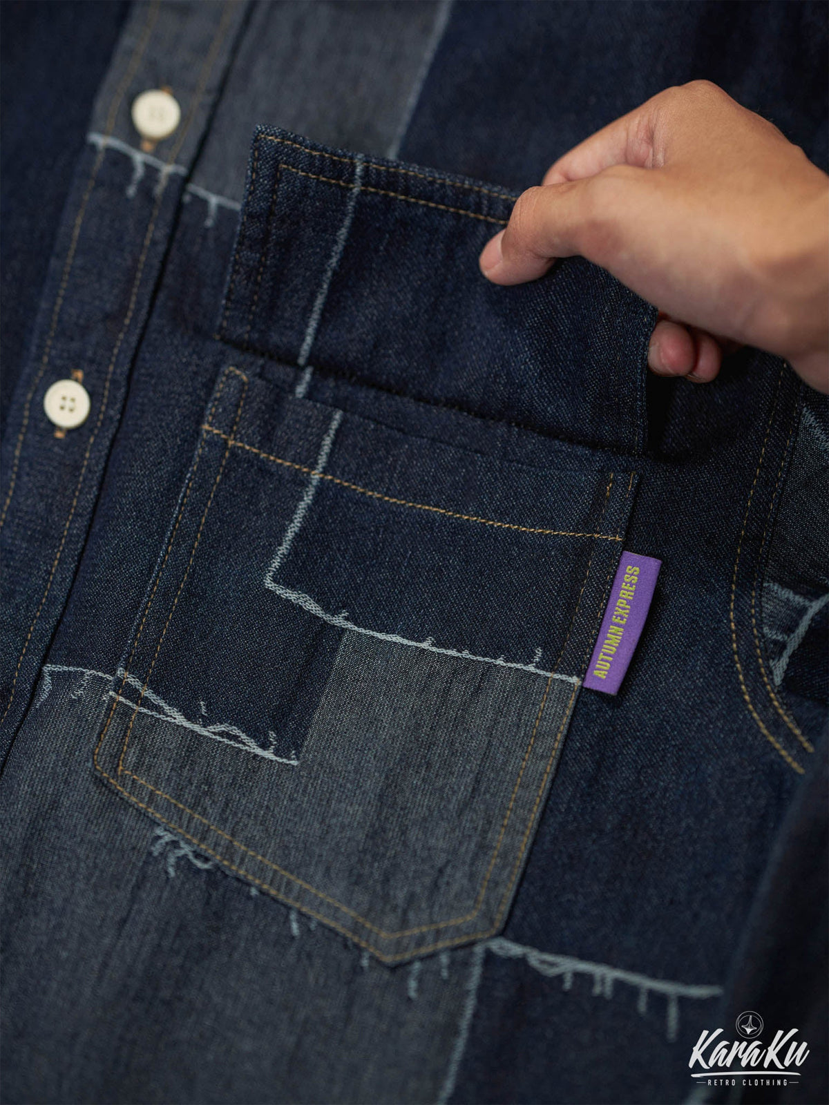 This vintage-inspired patchwork denim shirt features a unique two-tone design with indigo hues, creating a stylish and eye-catching look. Made from 100% cotton with a washed finish, it offers a soft feel and comfortable drape. The relaxed fit, with asymmetric pockets and a rounded hem, allows for versatile styling. Perfect as a standalone piece or layered over a tee for a fresh, casual look.